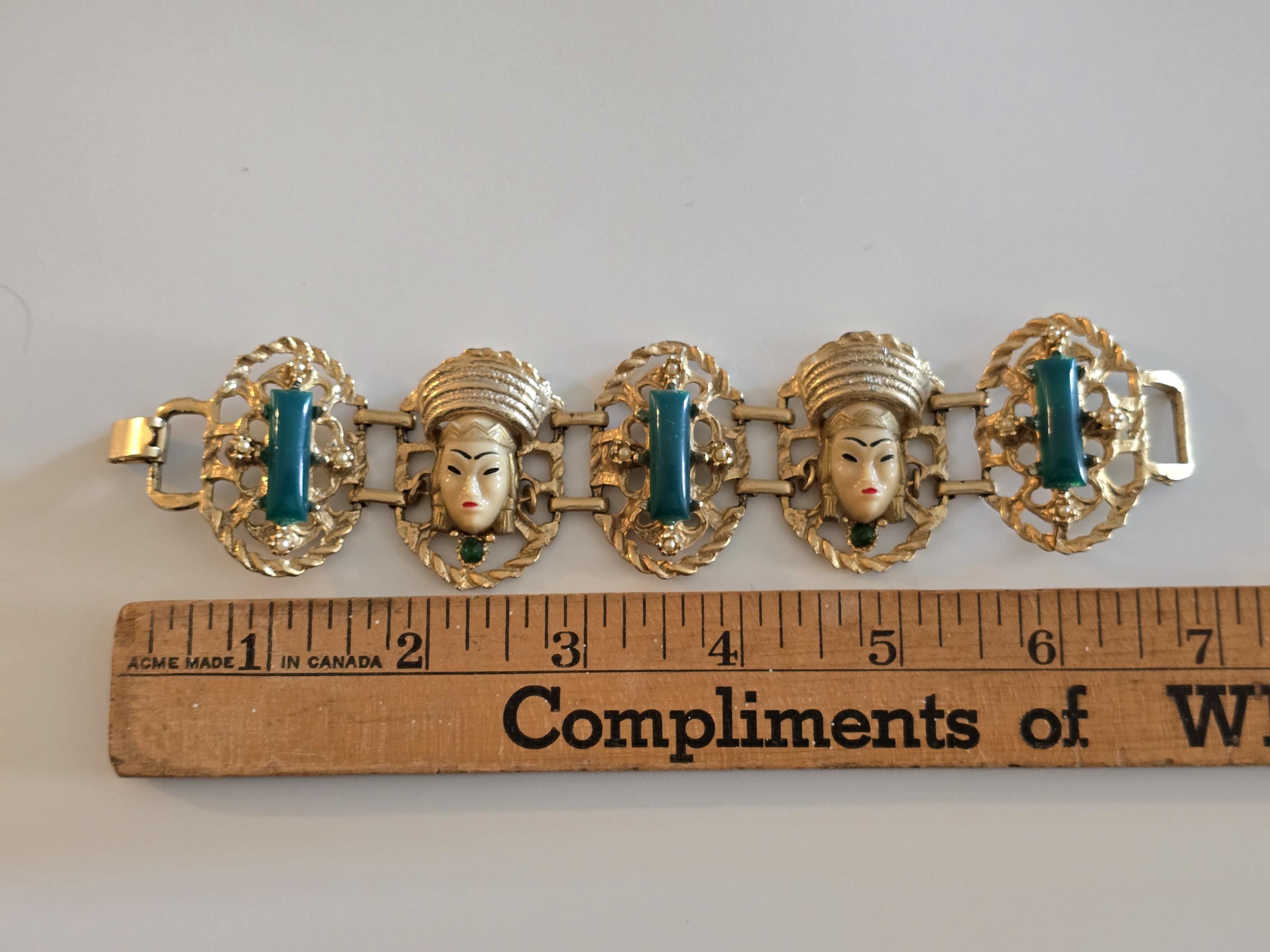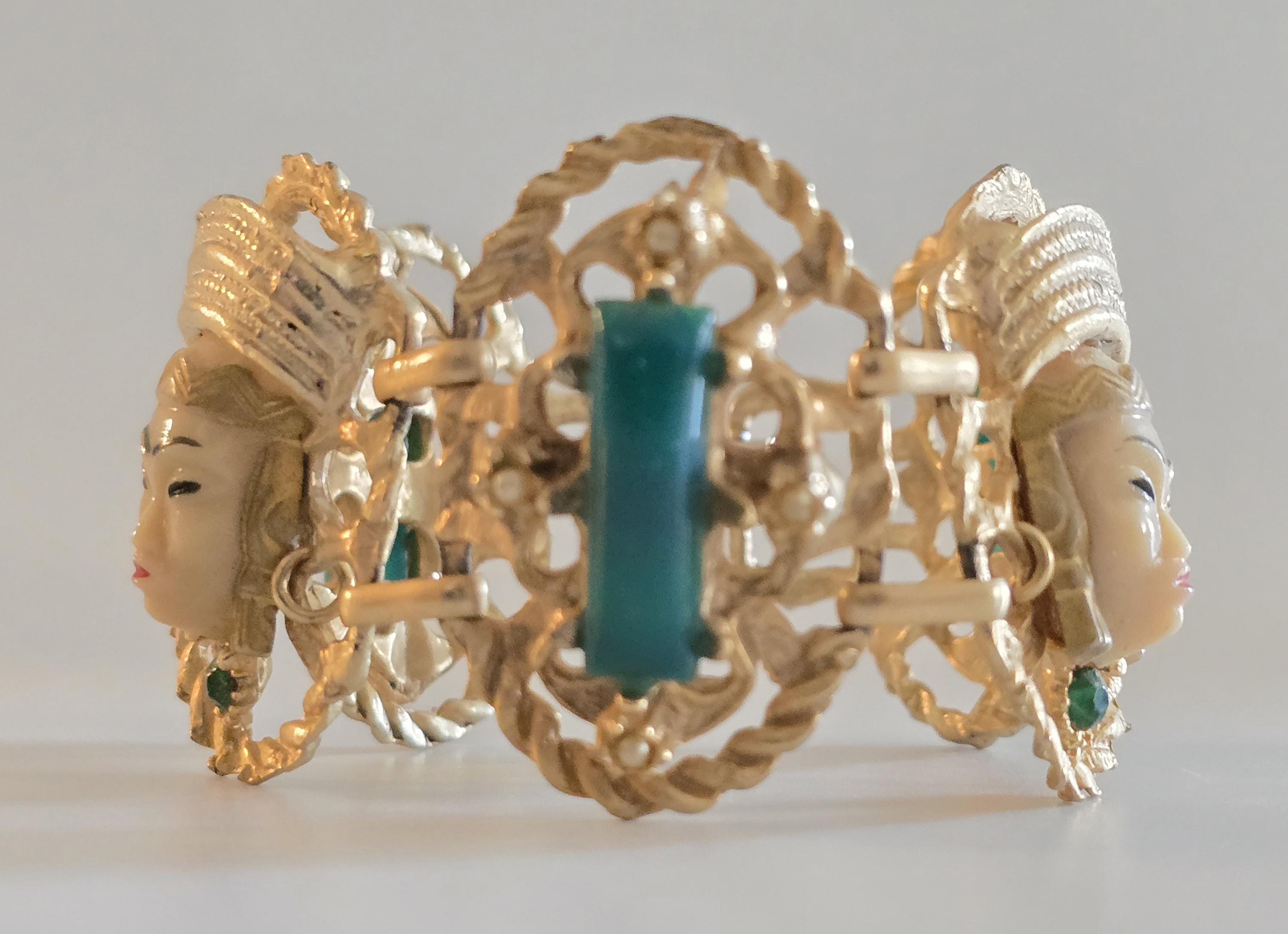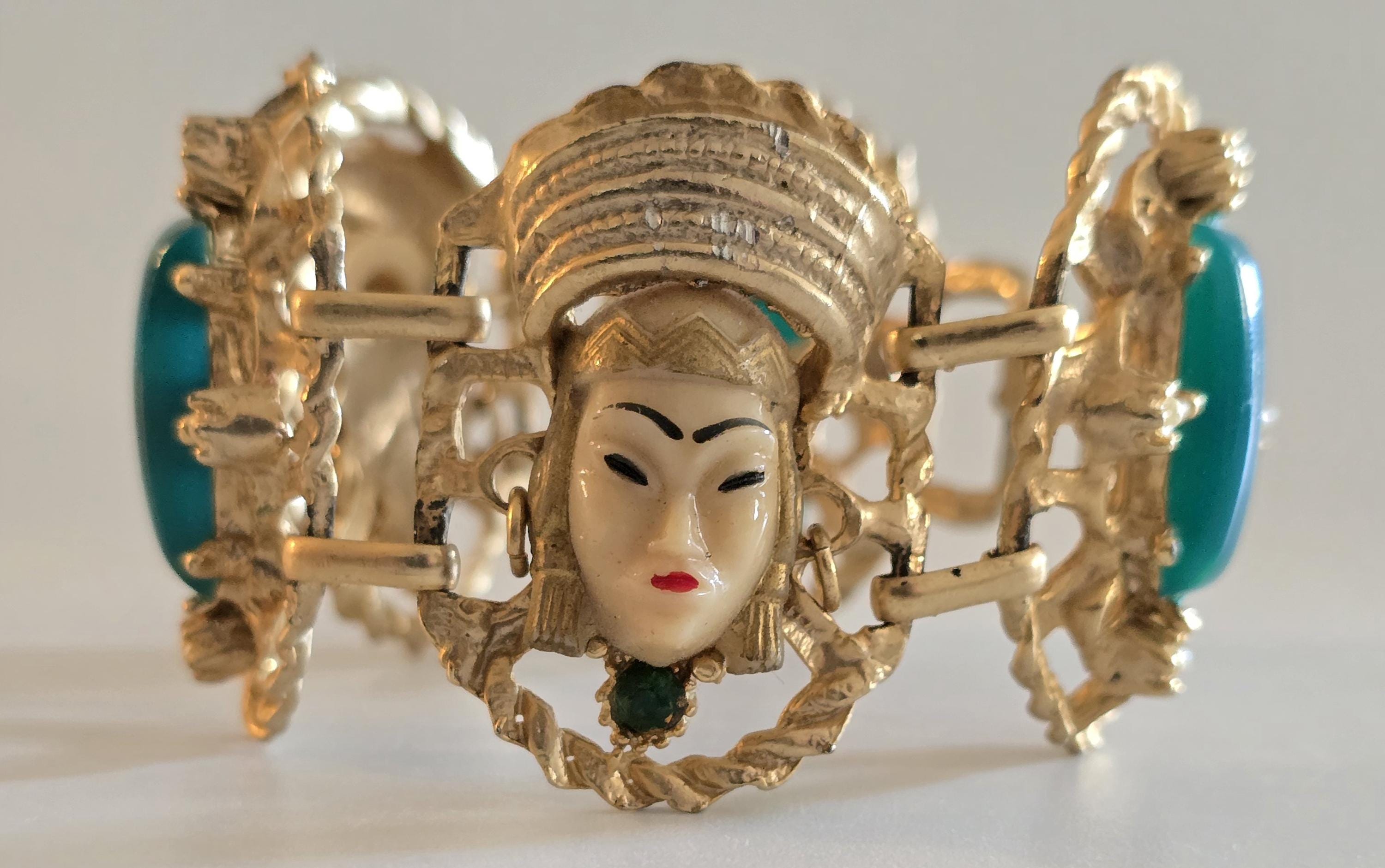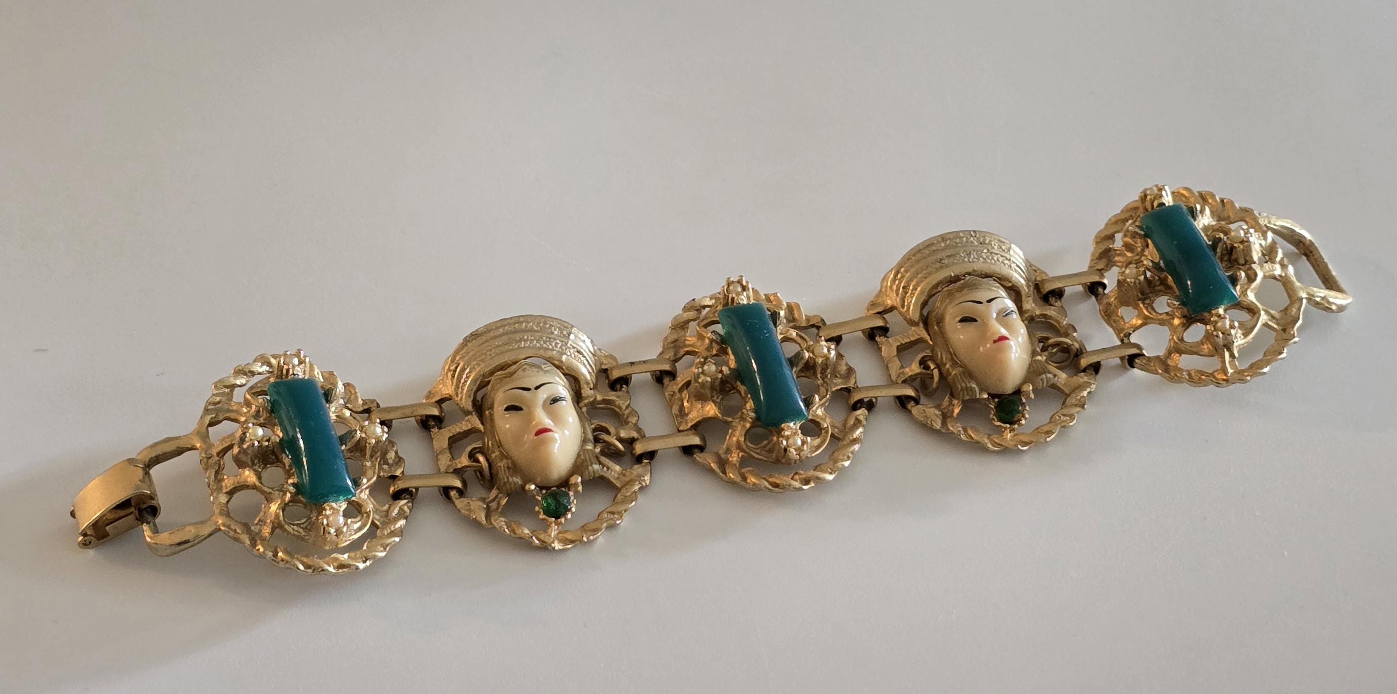 1950s-1960s Aisan Queen or Princess 5 Panel bracelet. Unsigned and appears to be by Mack Henfield and Sons. Queens Head Siamese Jewelry. Acrylic cabachons are rectangular and the faces are glass.