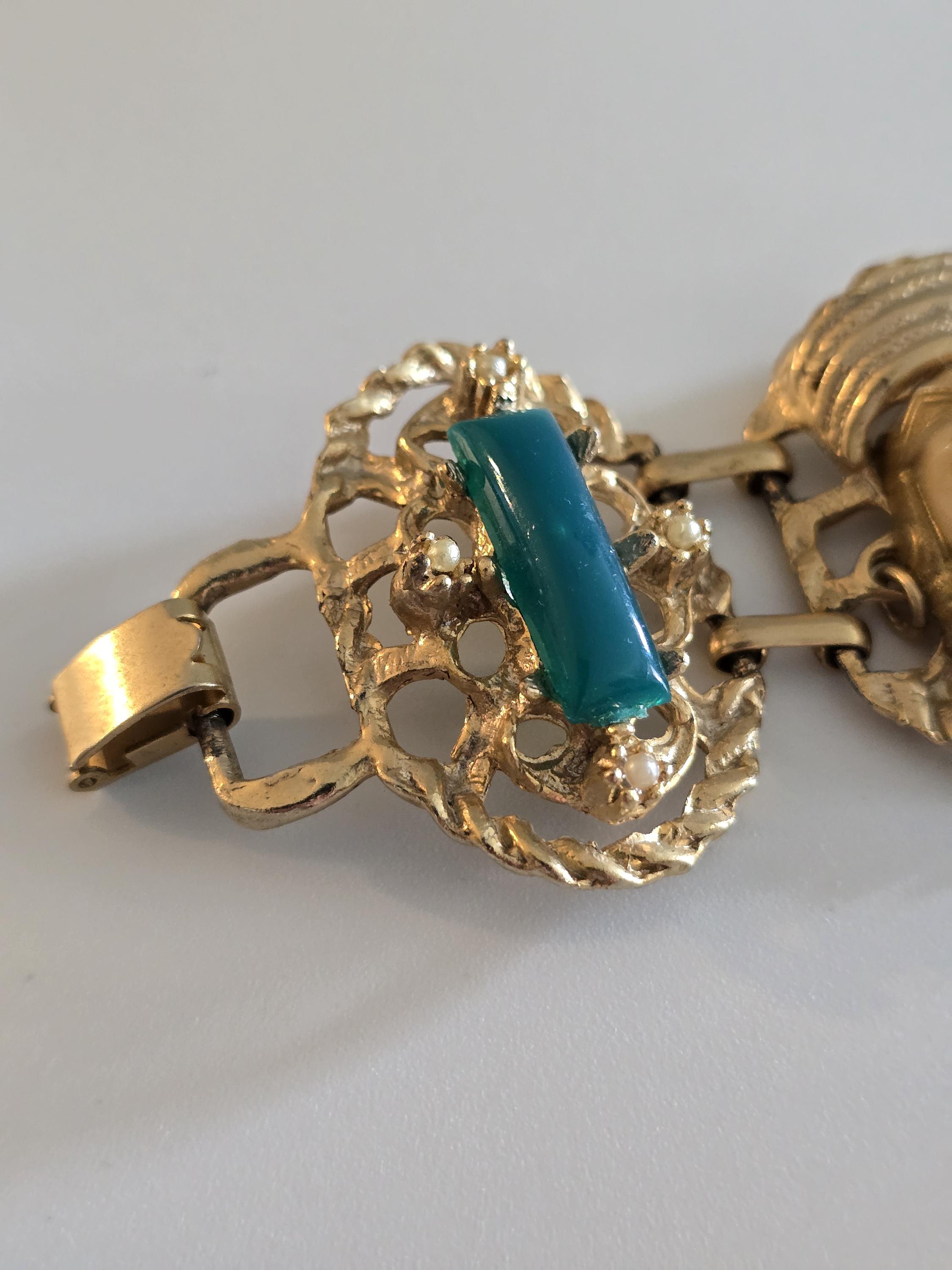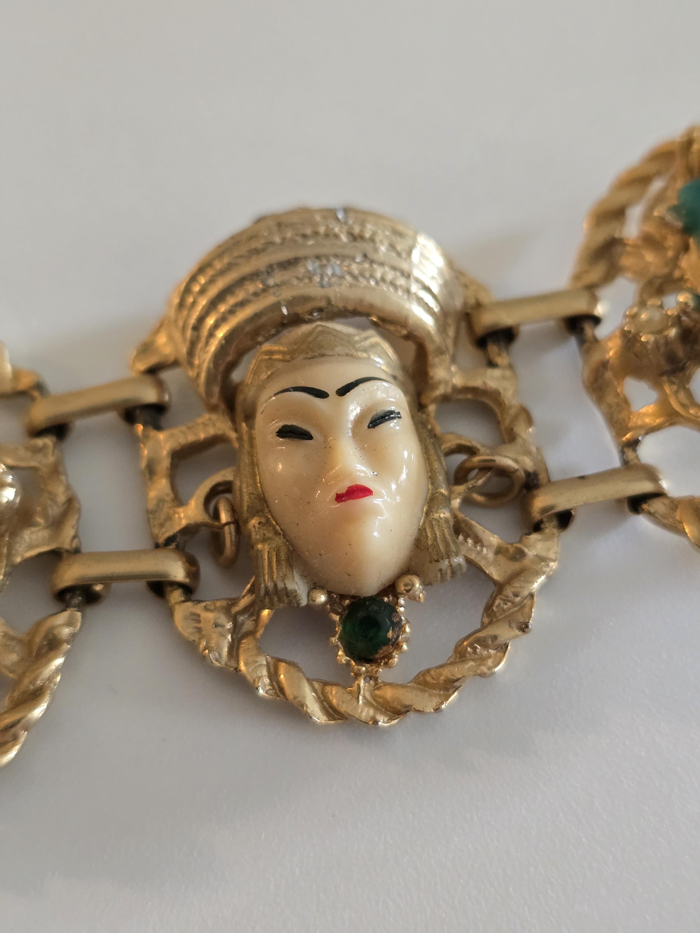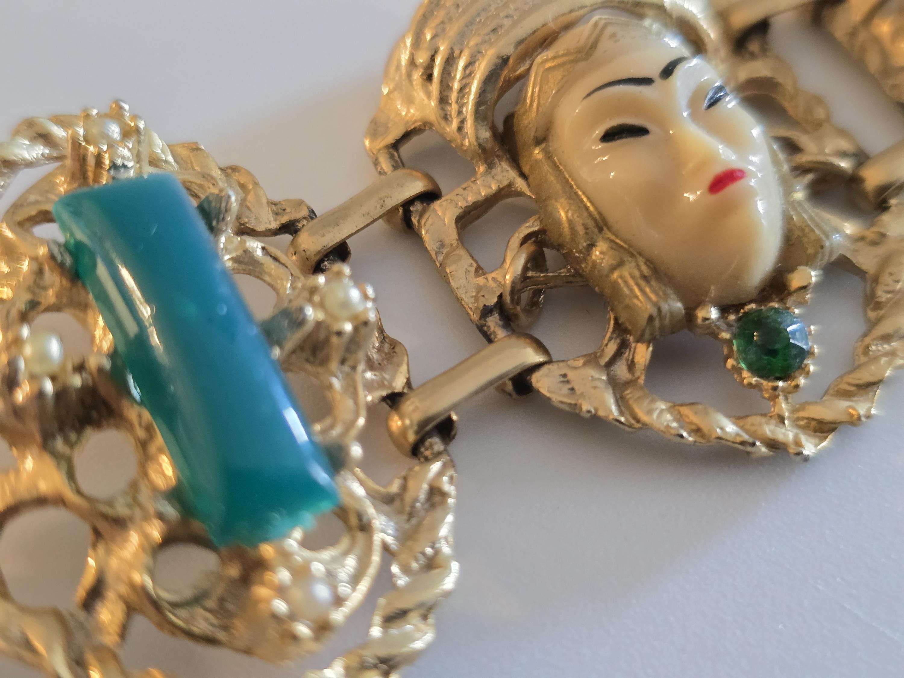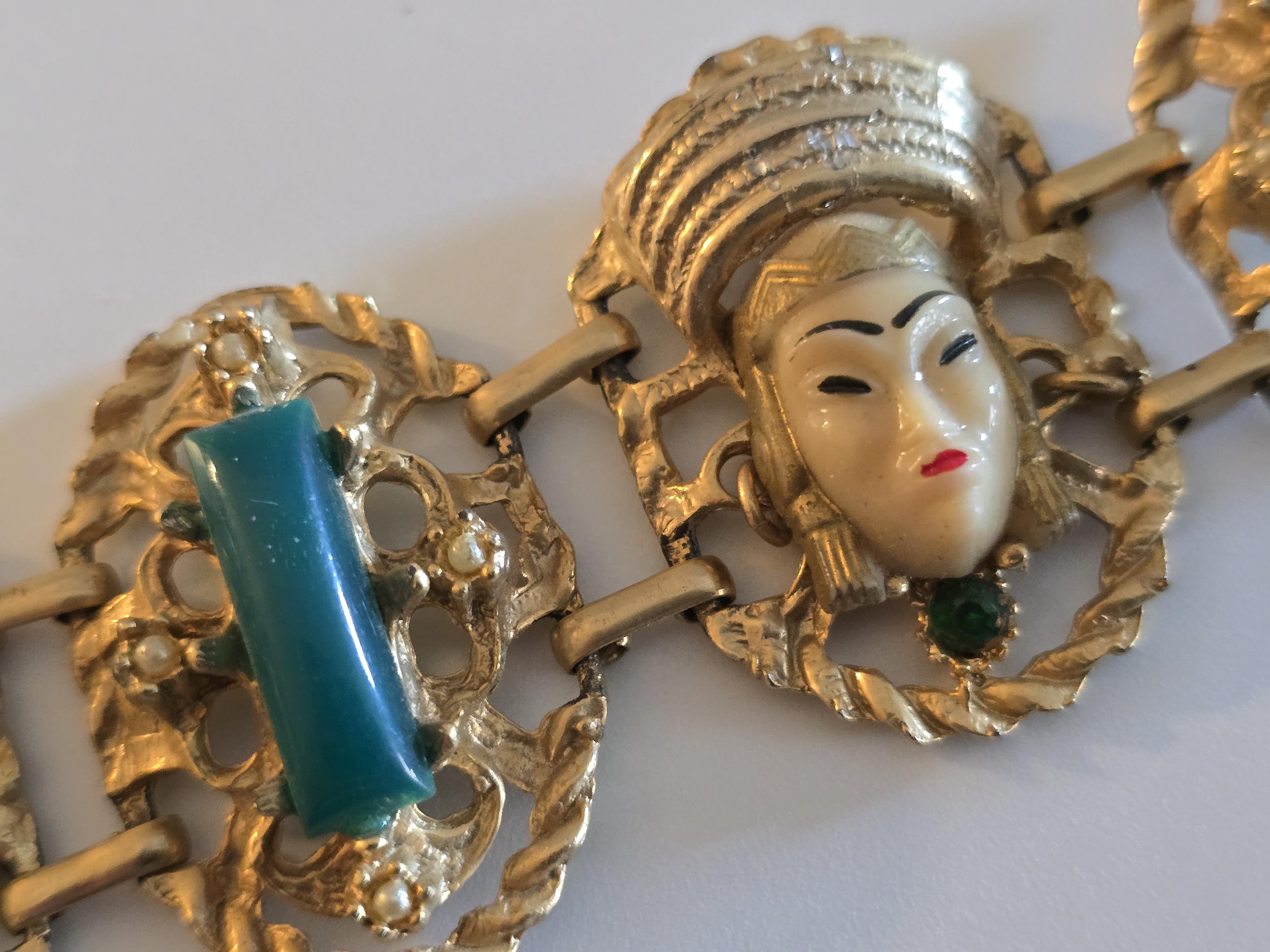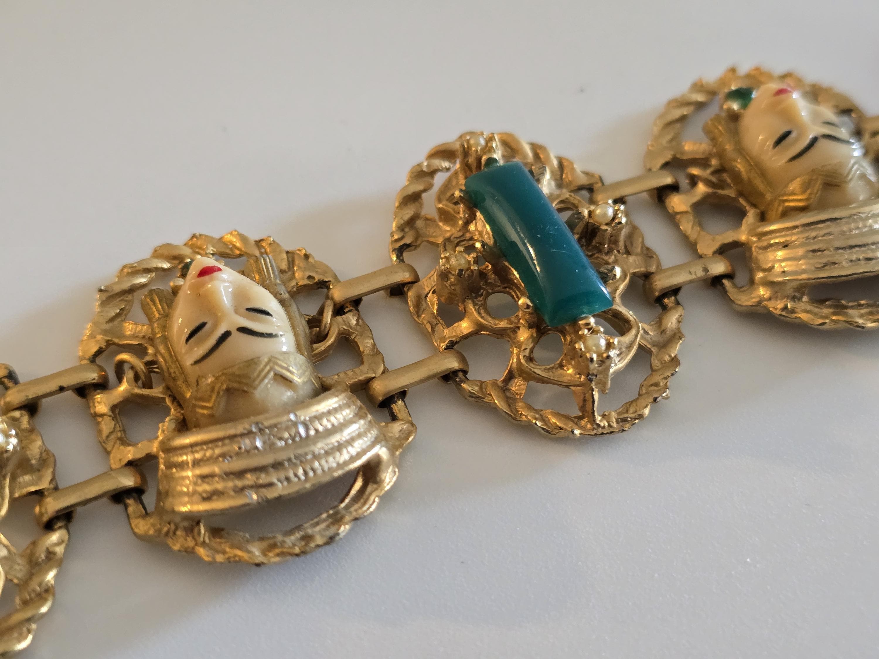1950s-1960s Aisan Queen or Princess 5 Panel bracelet. Unsigned and appears to be by Mack Henfield and Sons. Queens Head Siamese Jewelry. Acrylic cabachons are rectangular and the faces are glass.
