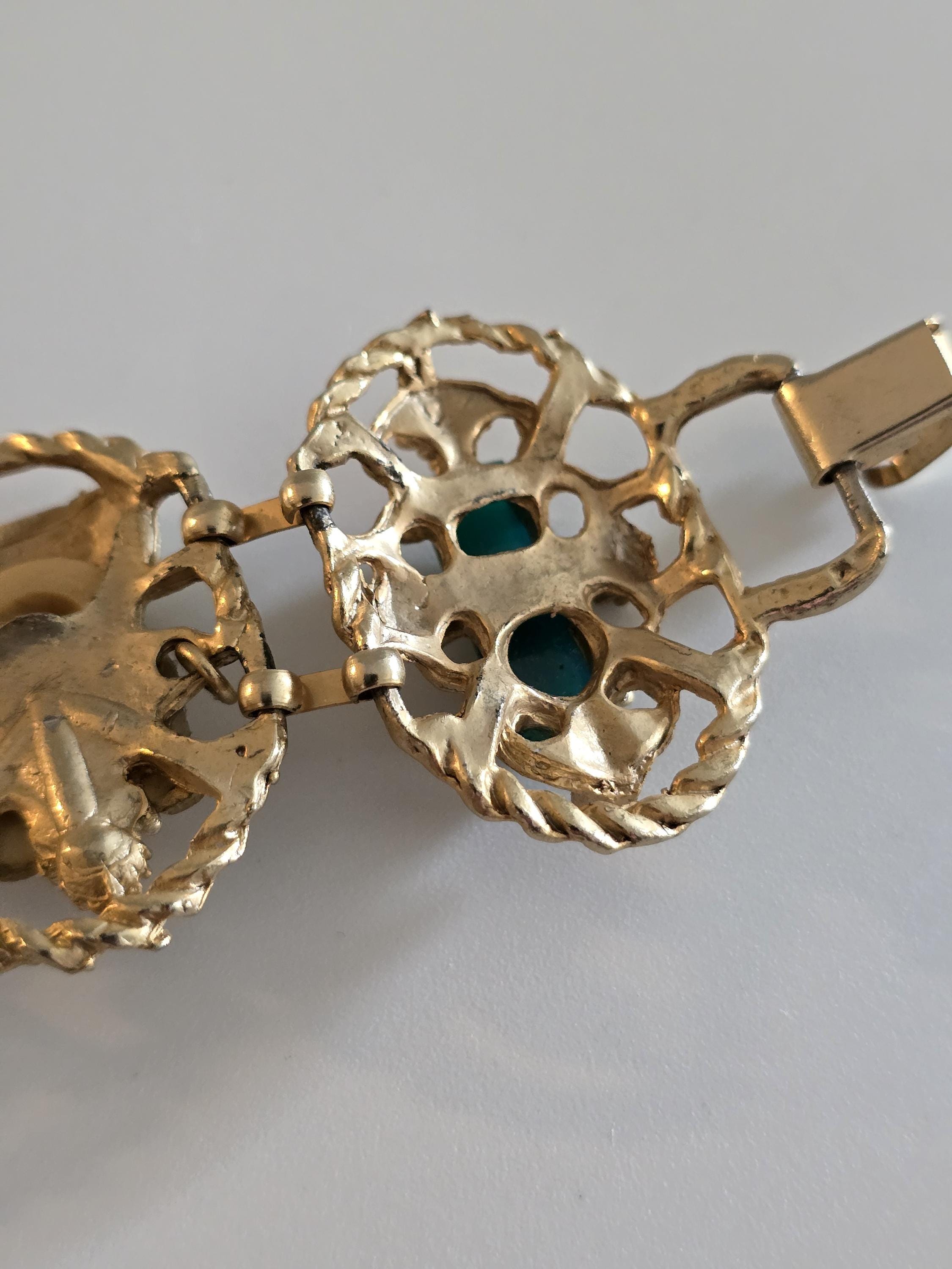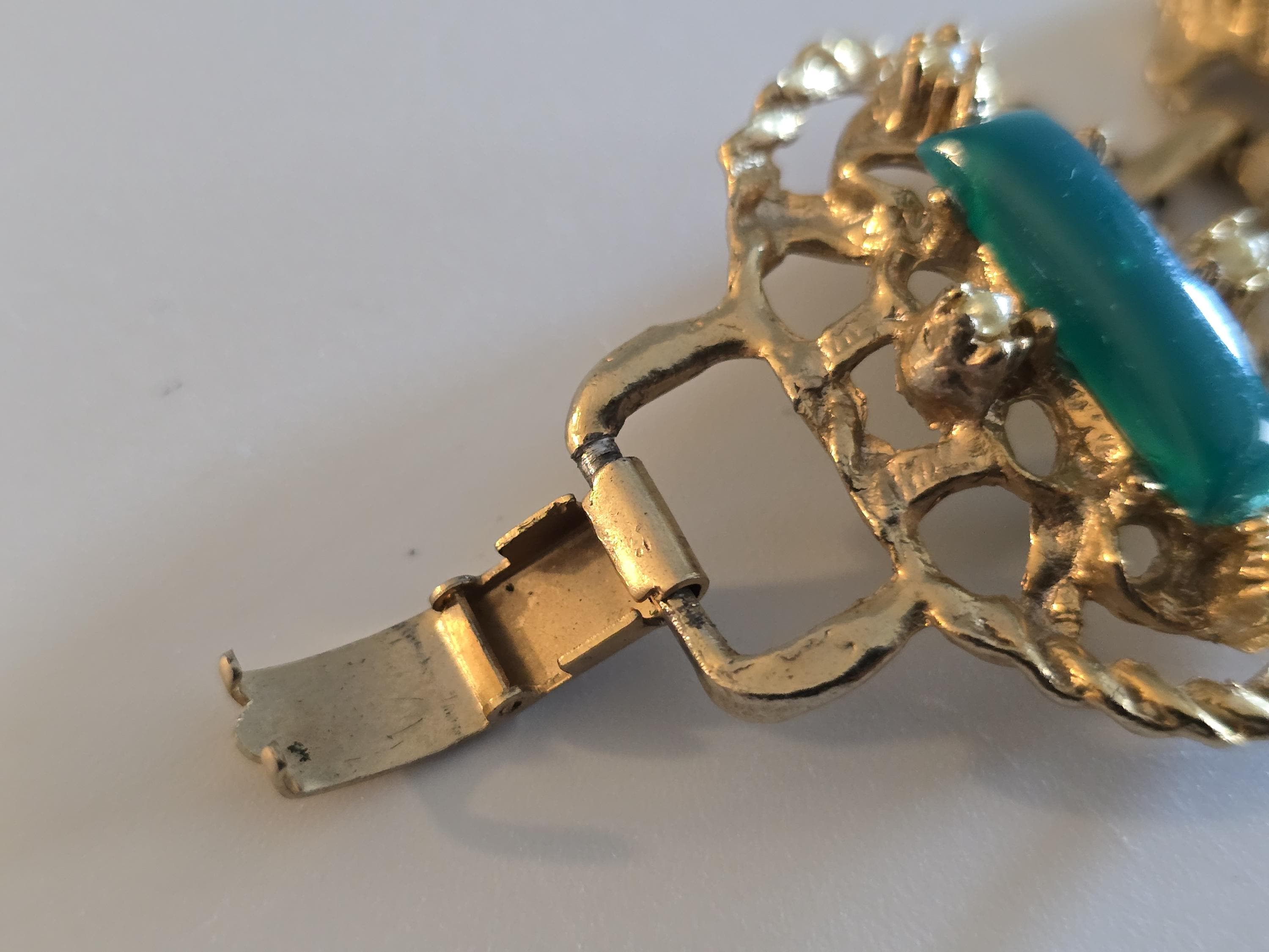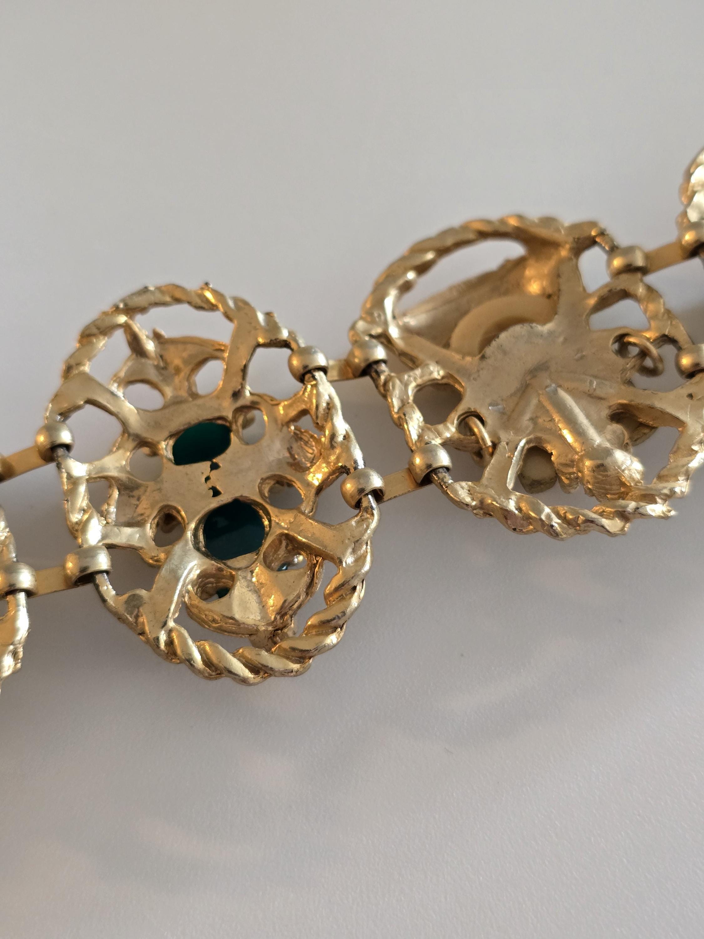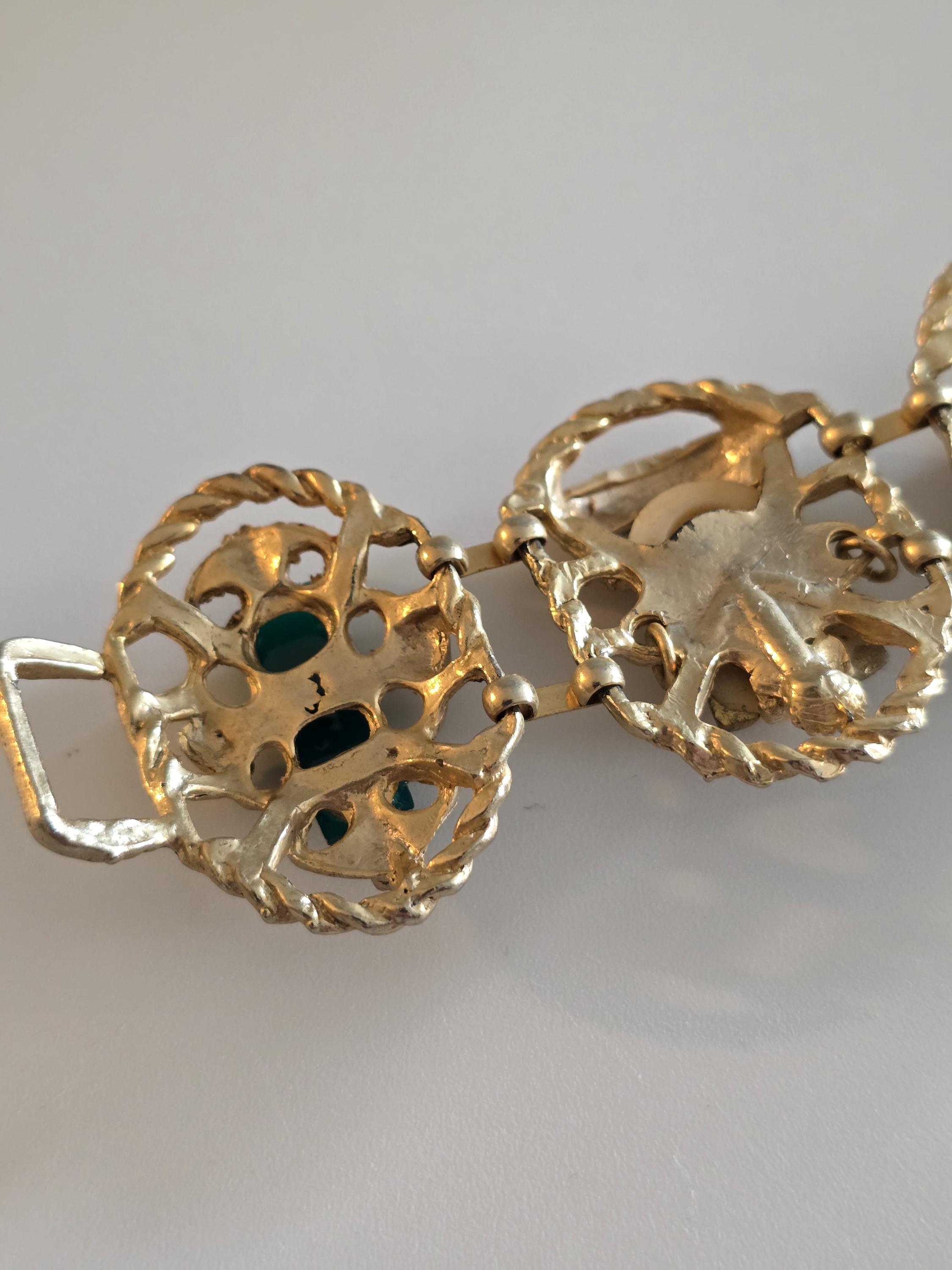 1950s-1960s Aisan Queen or Princess 5 Panel bracelet. Unsigned and appears to be by Mack Henfield and Sons. Queens Head Siamese Jewelry. Acrylic cabachons are rectangular and the faces are glass.
