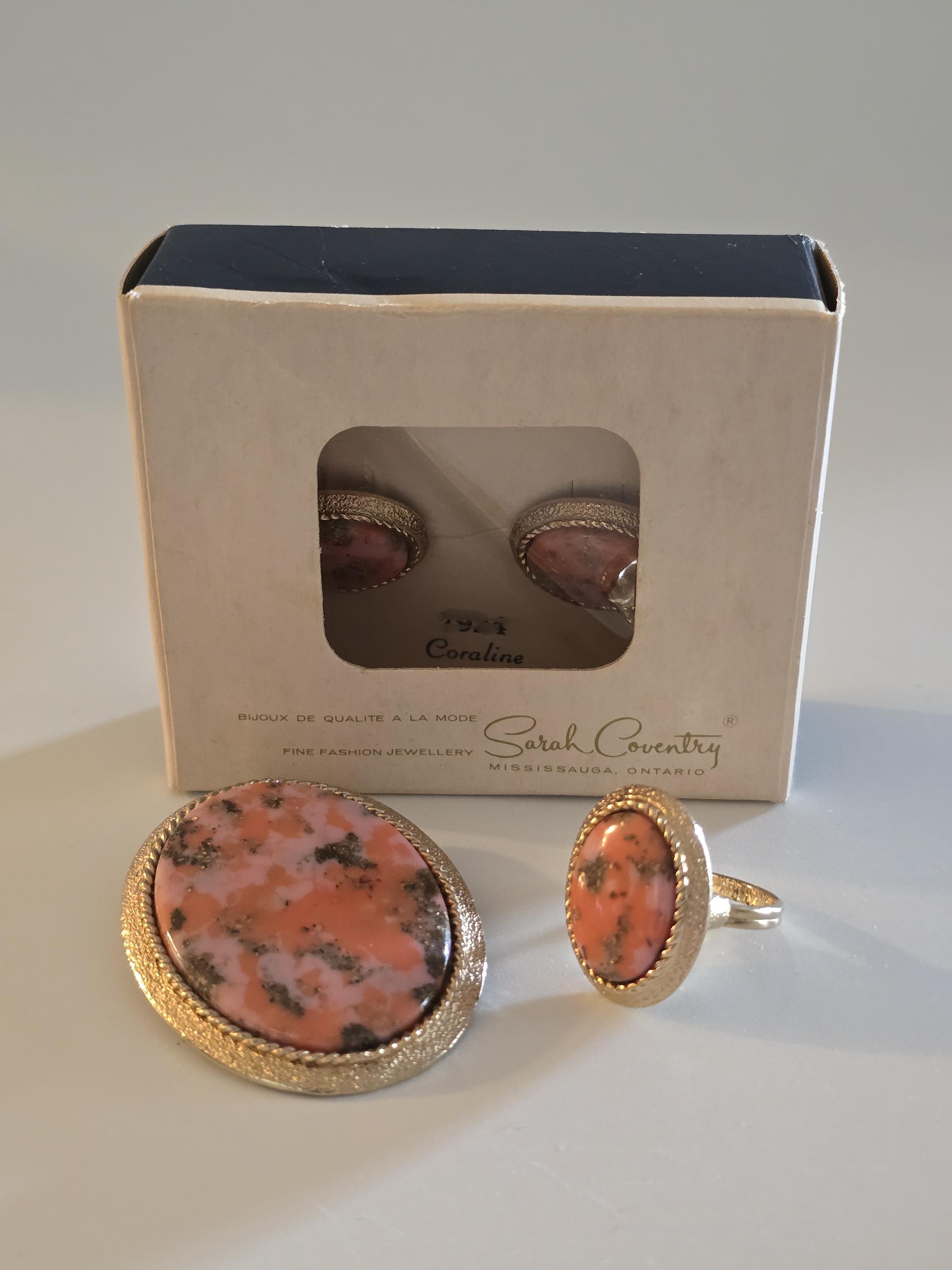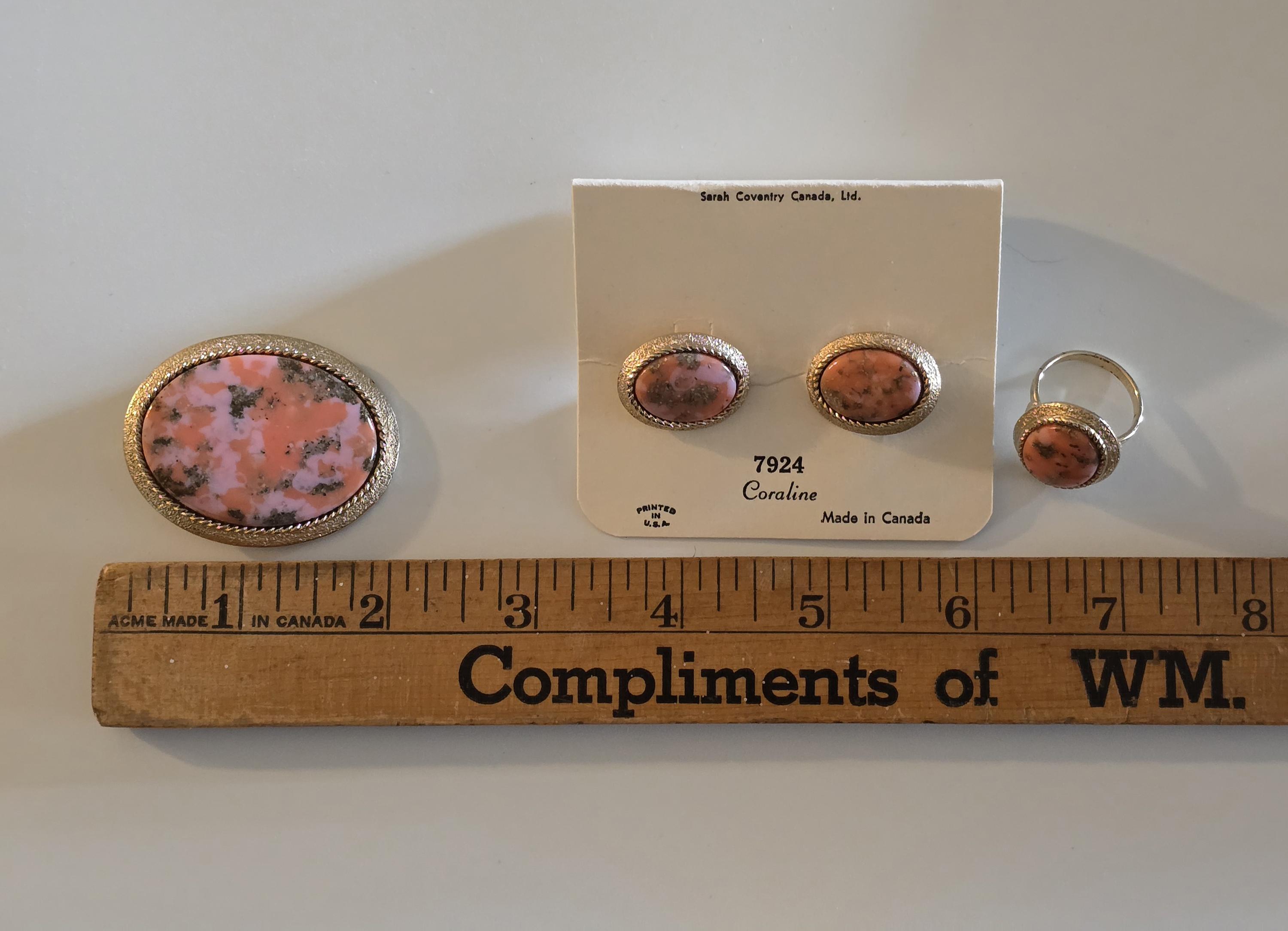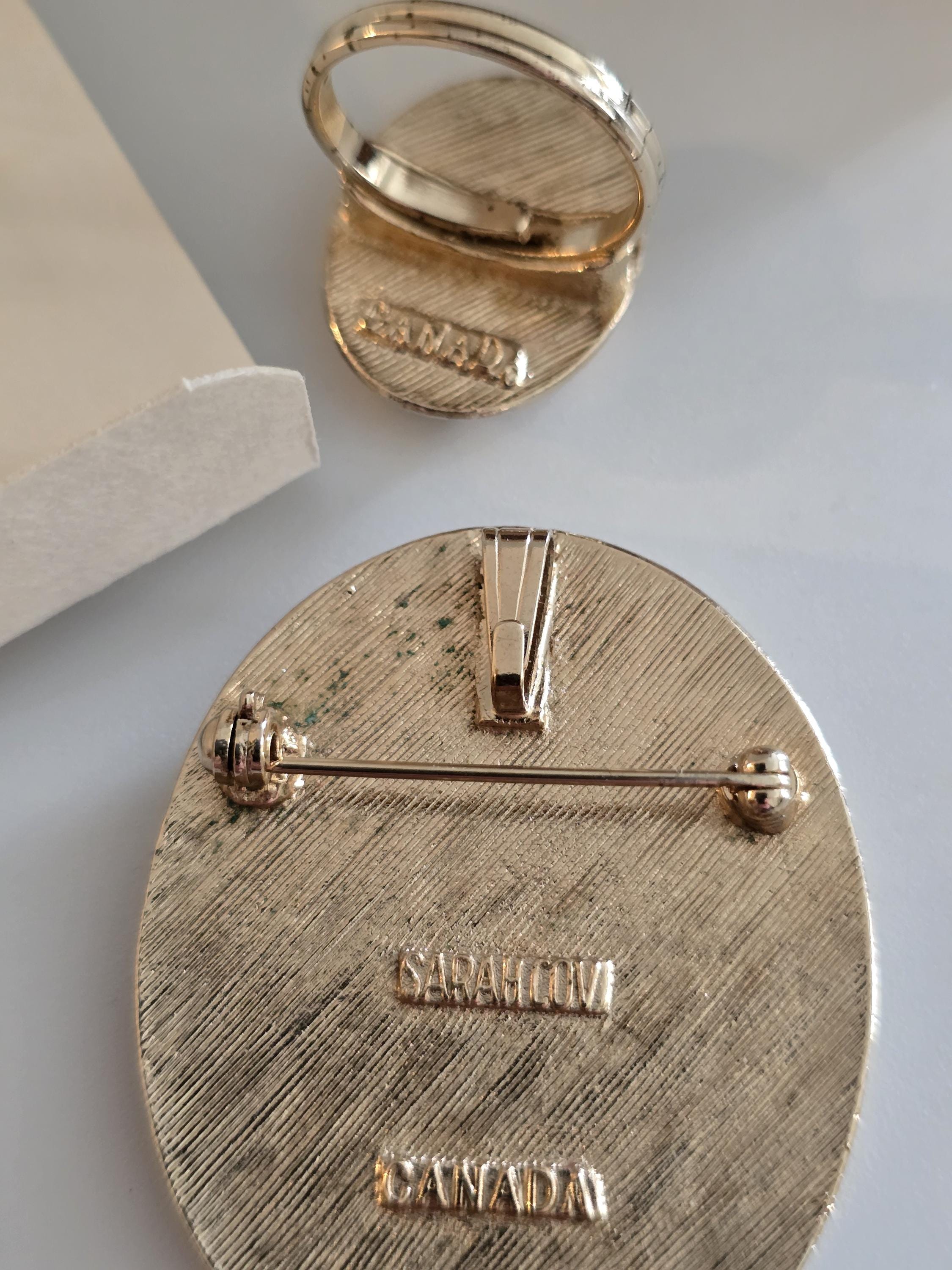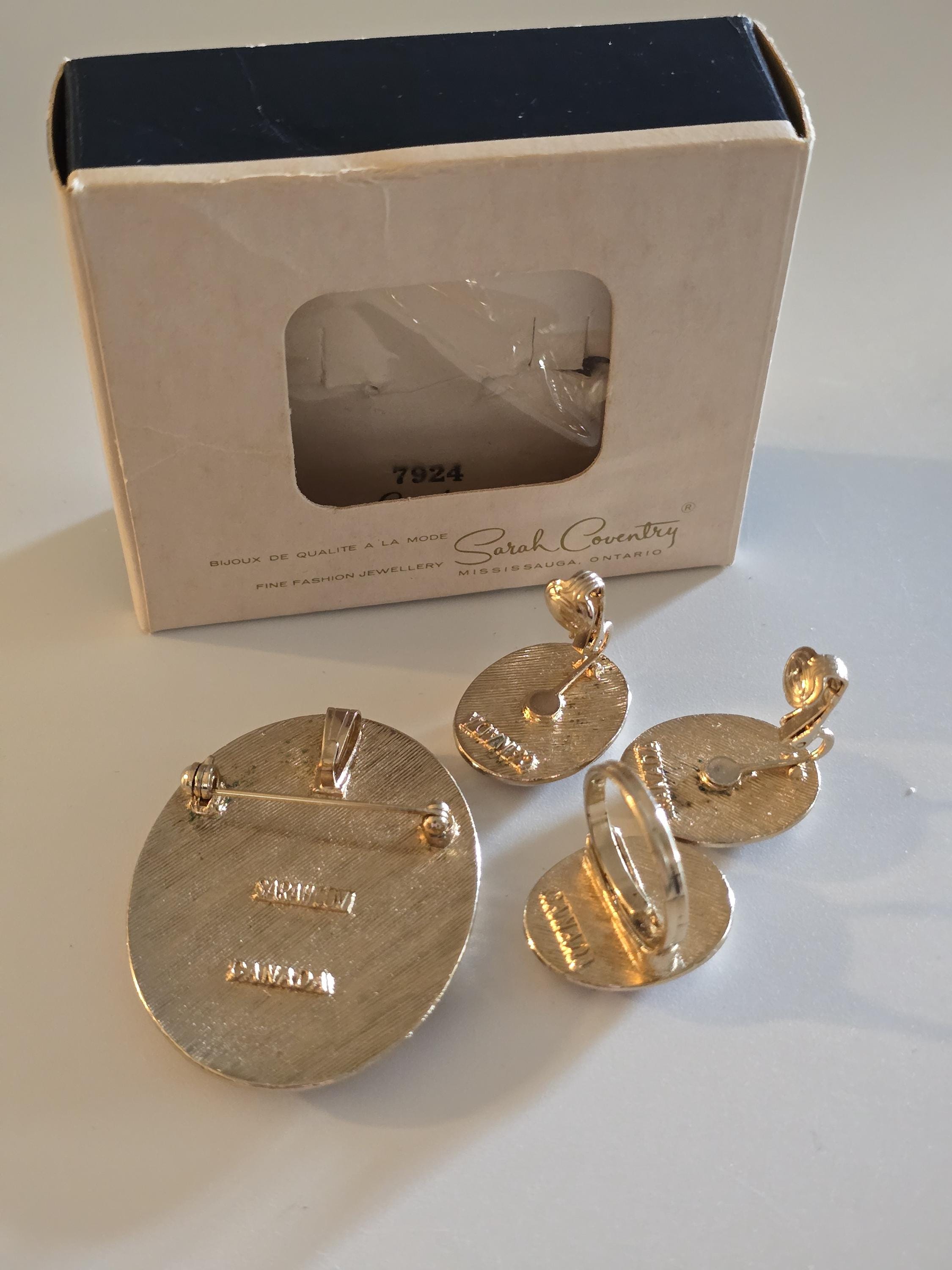 The ring is adjustable. Clip on earrings. The brooch can be worn also be worn as a pendant.