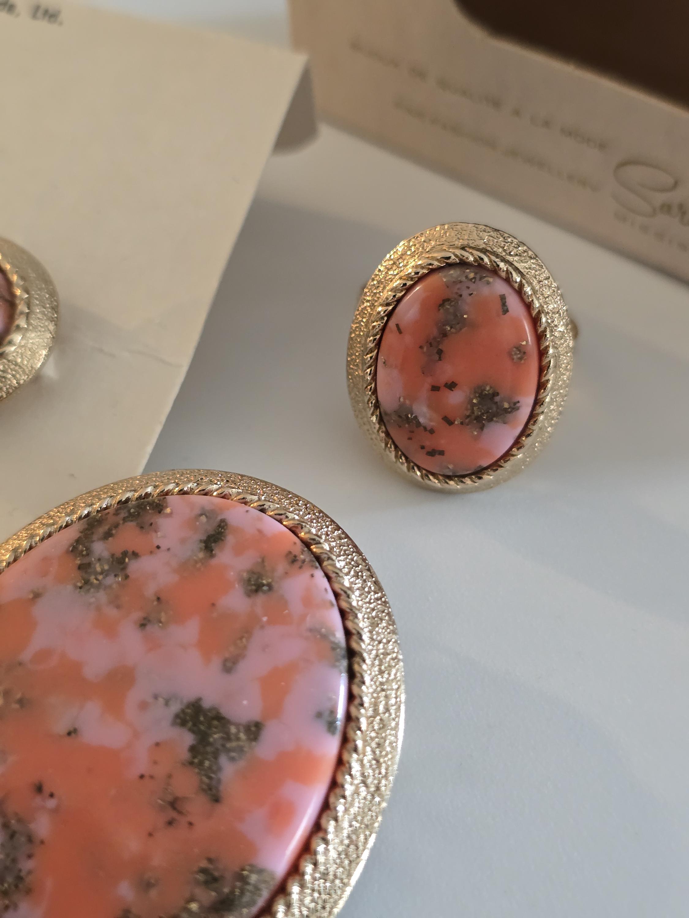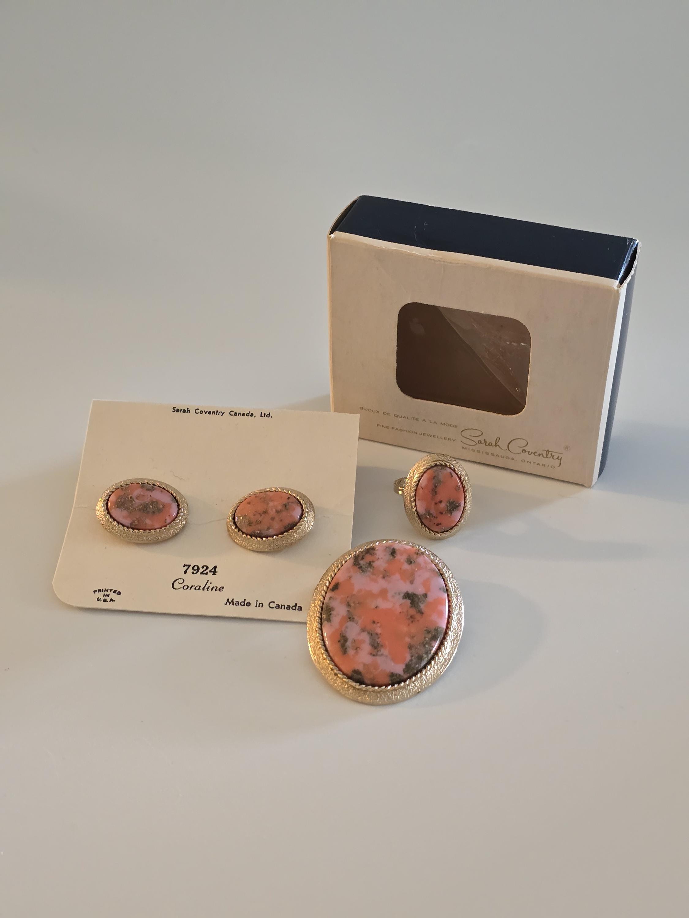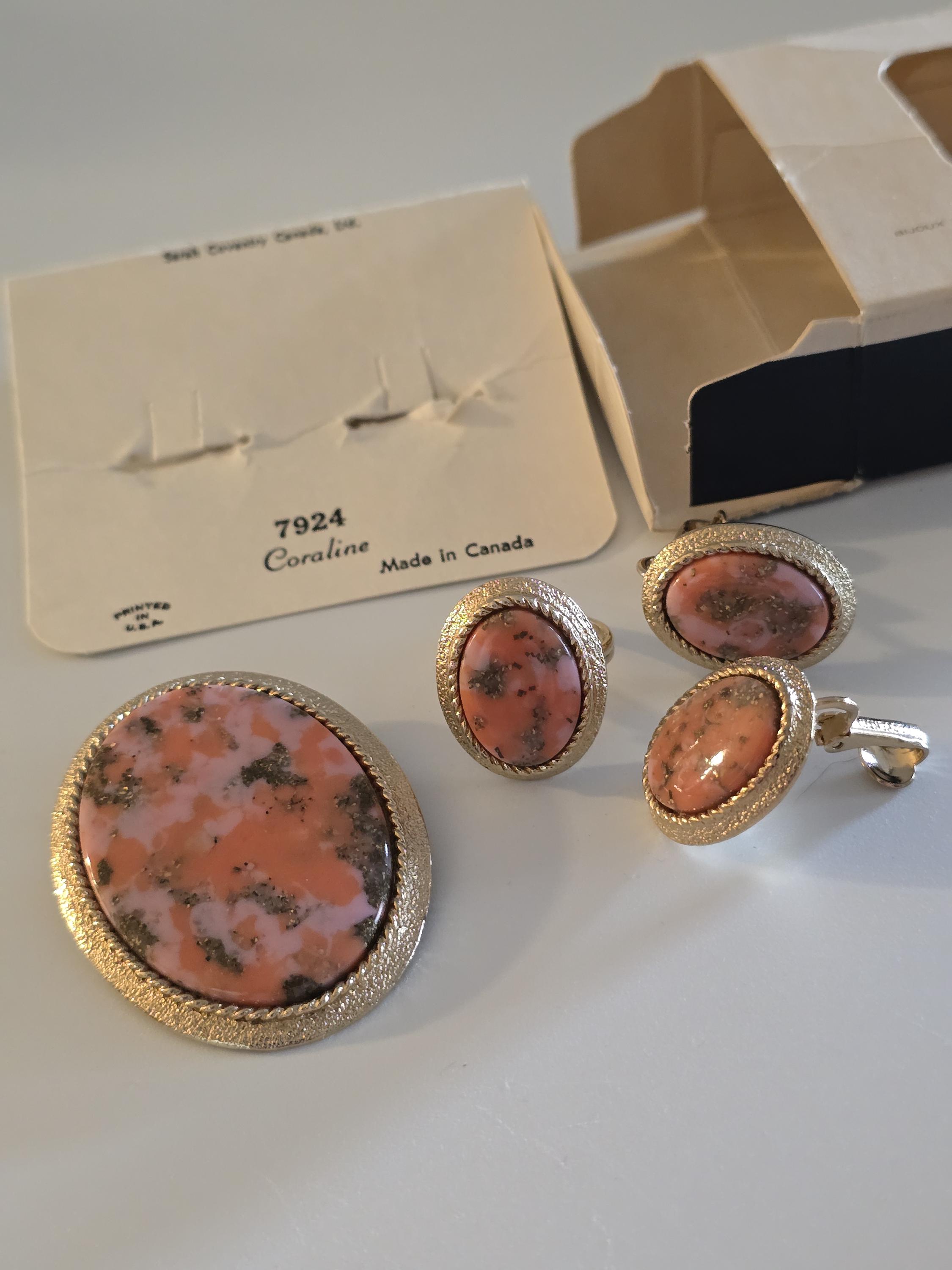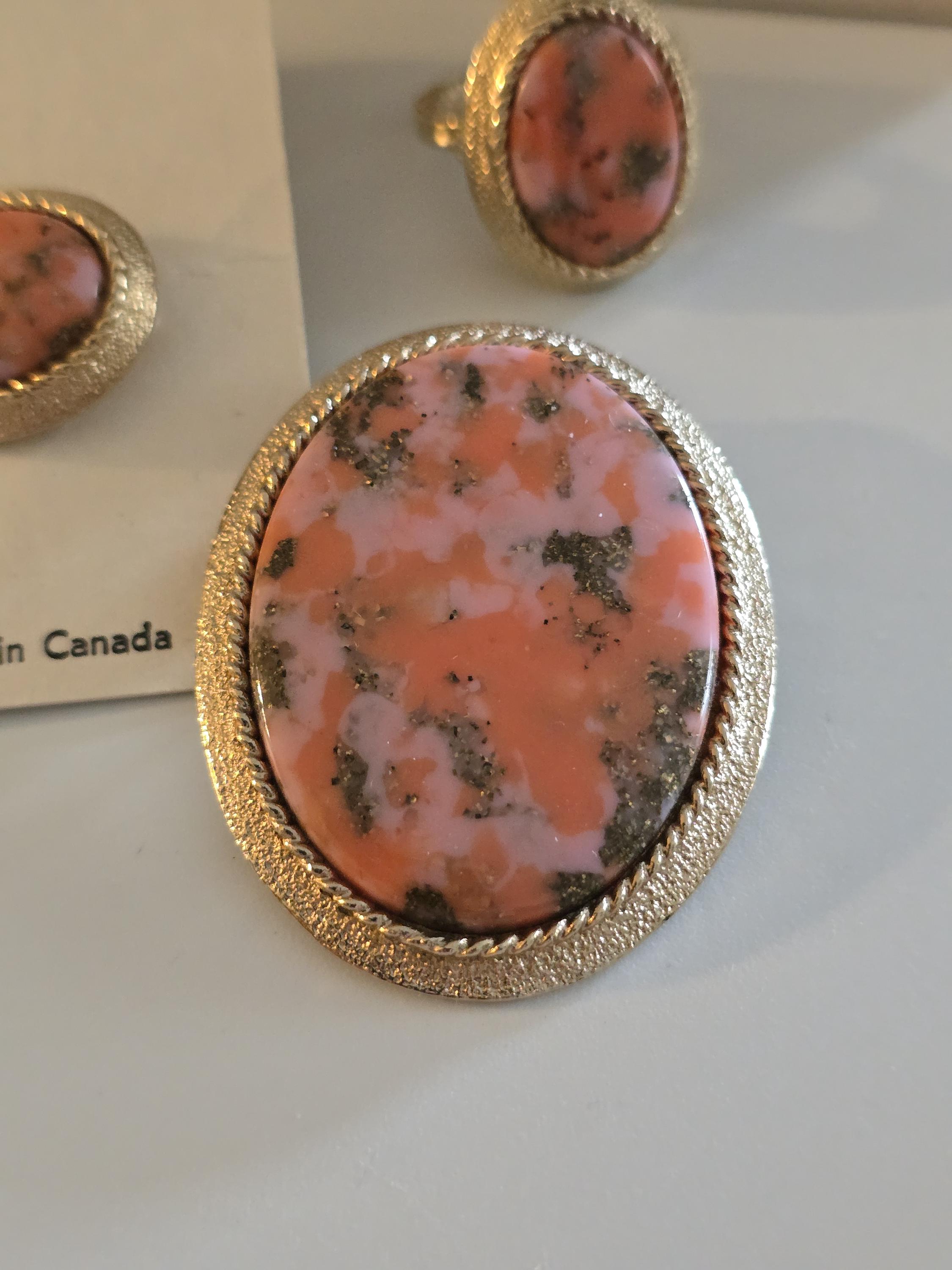 The ring is adjustable. Clip on earrings. The brooch can be worn also be worn as a pendant.