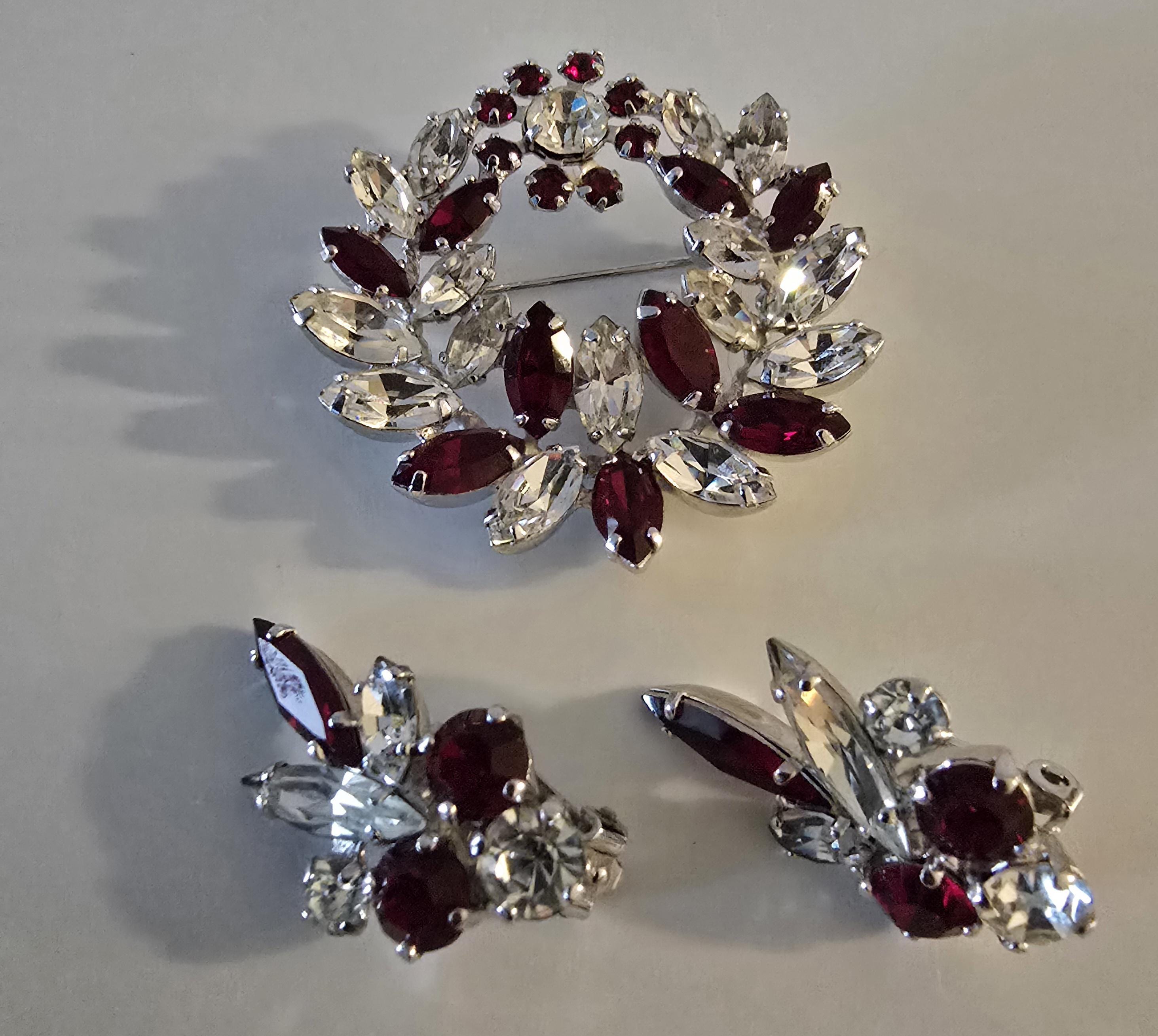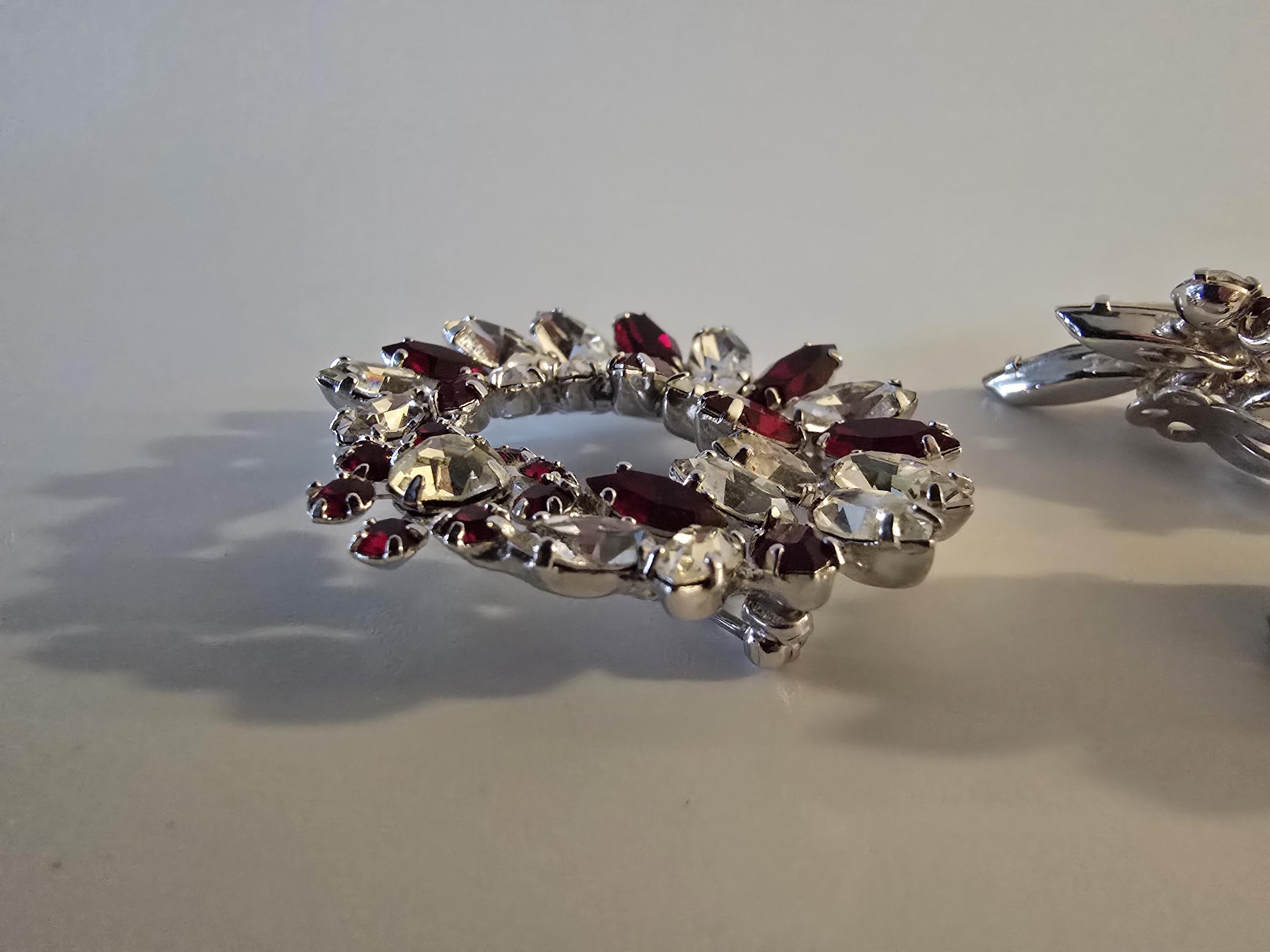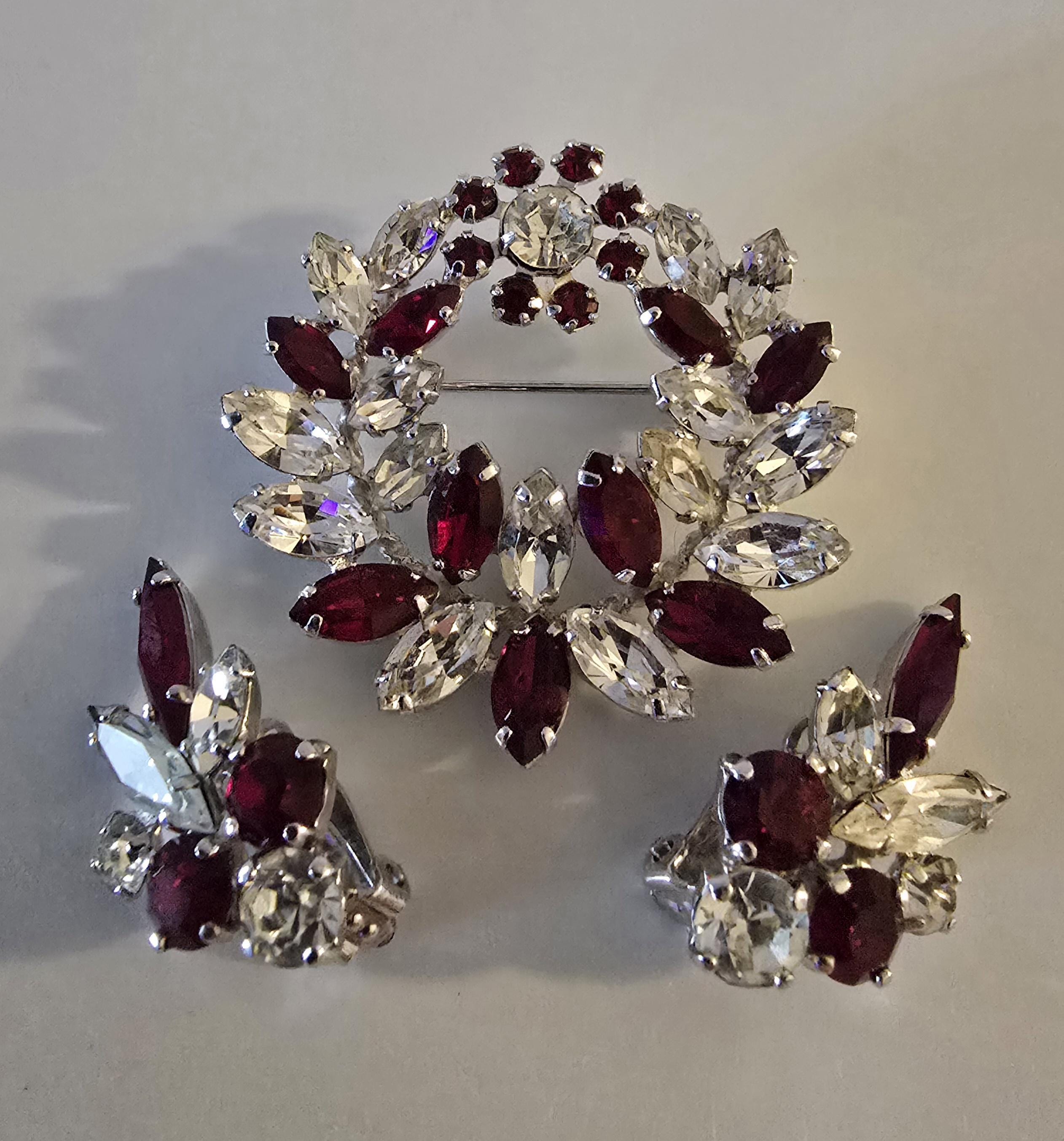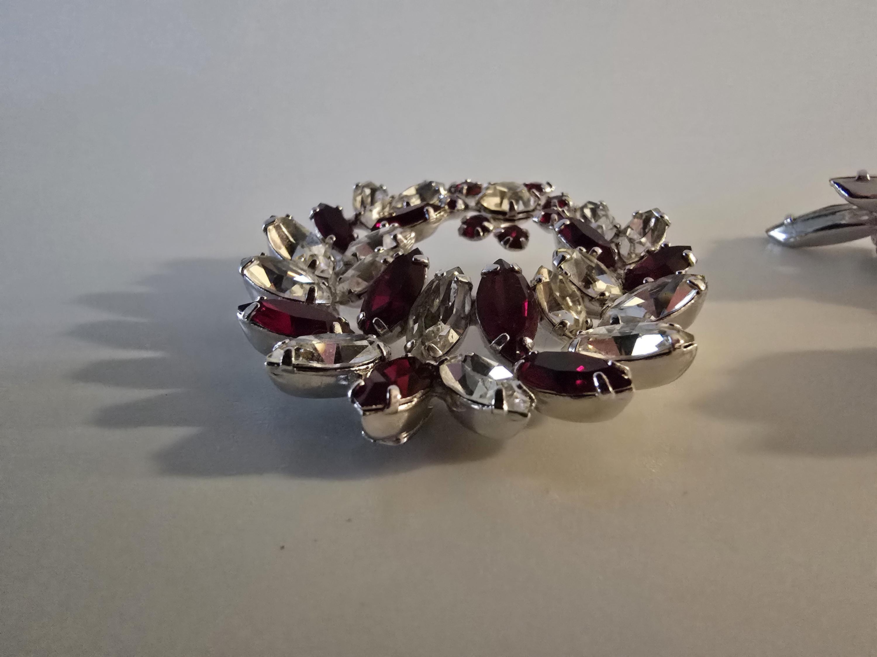 Lovely brooch and earring set by Sherman! Red and clear Swarovski crystals set in silver toned and rhodium plated. Brooch is signed, earrings are not.