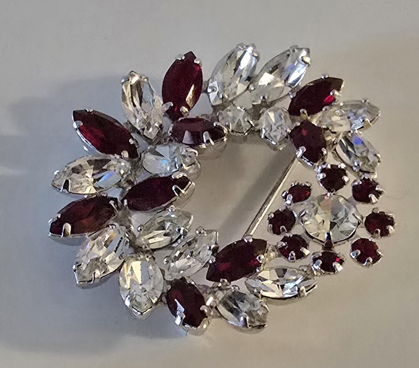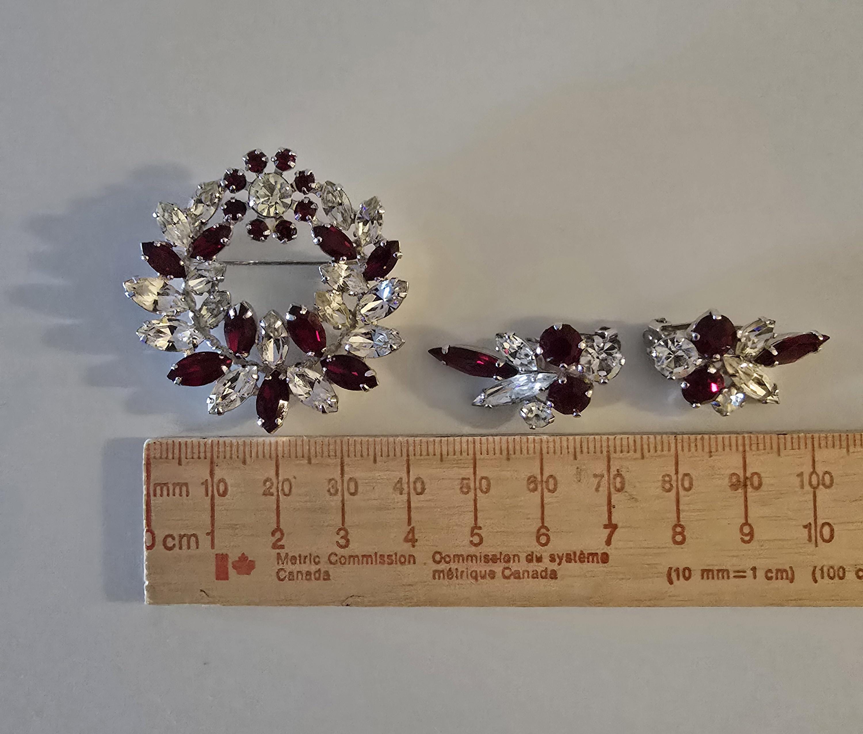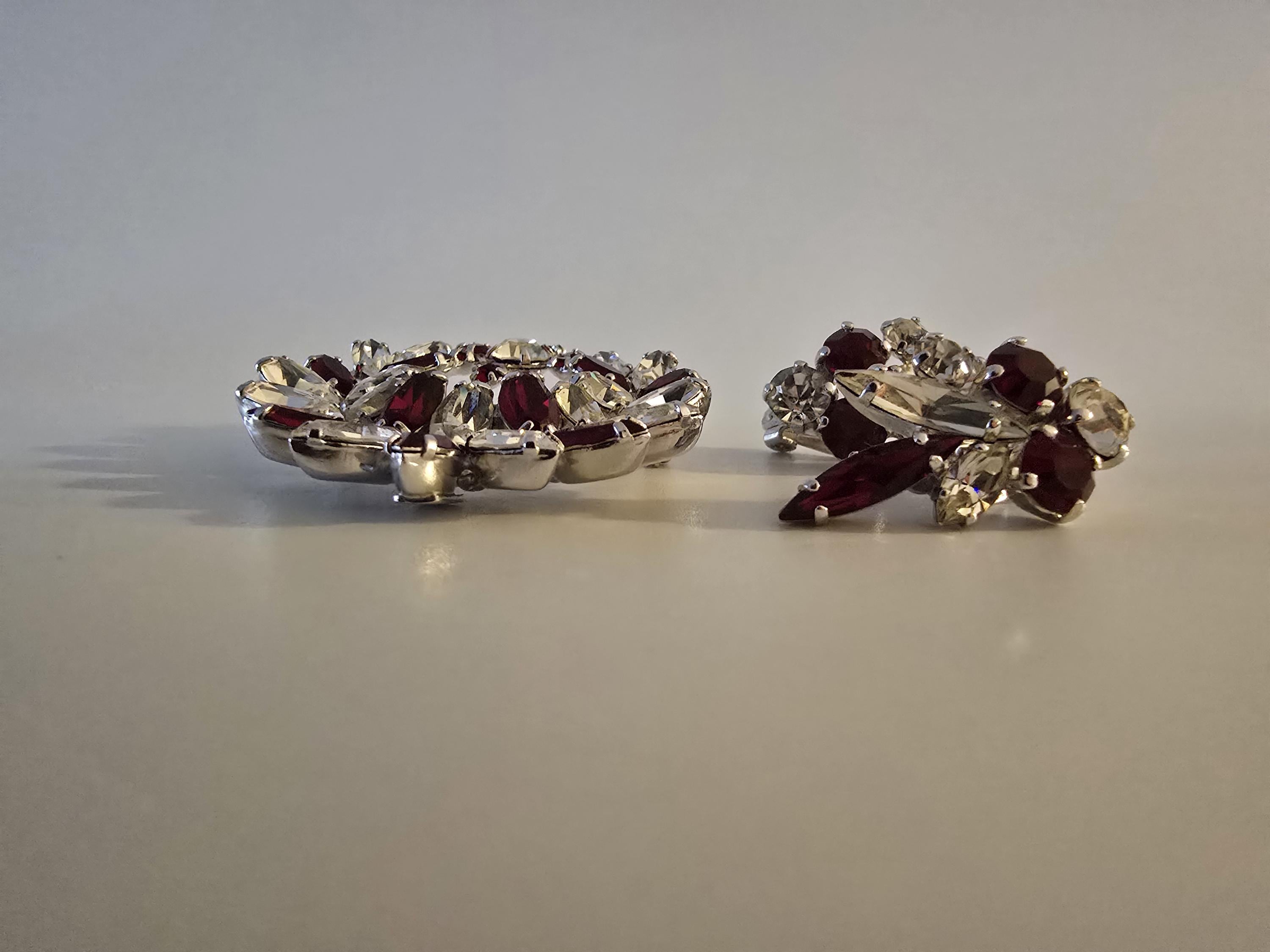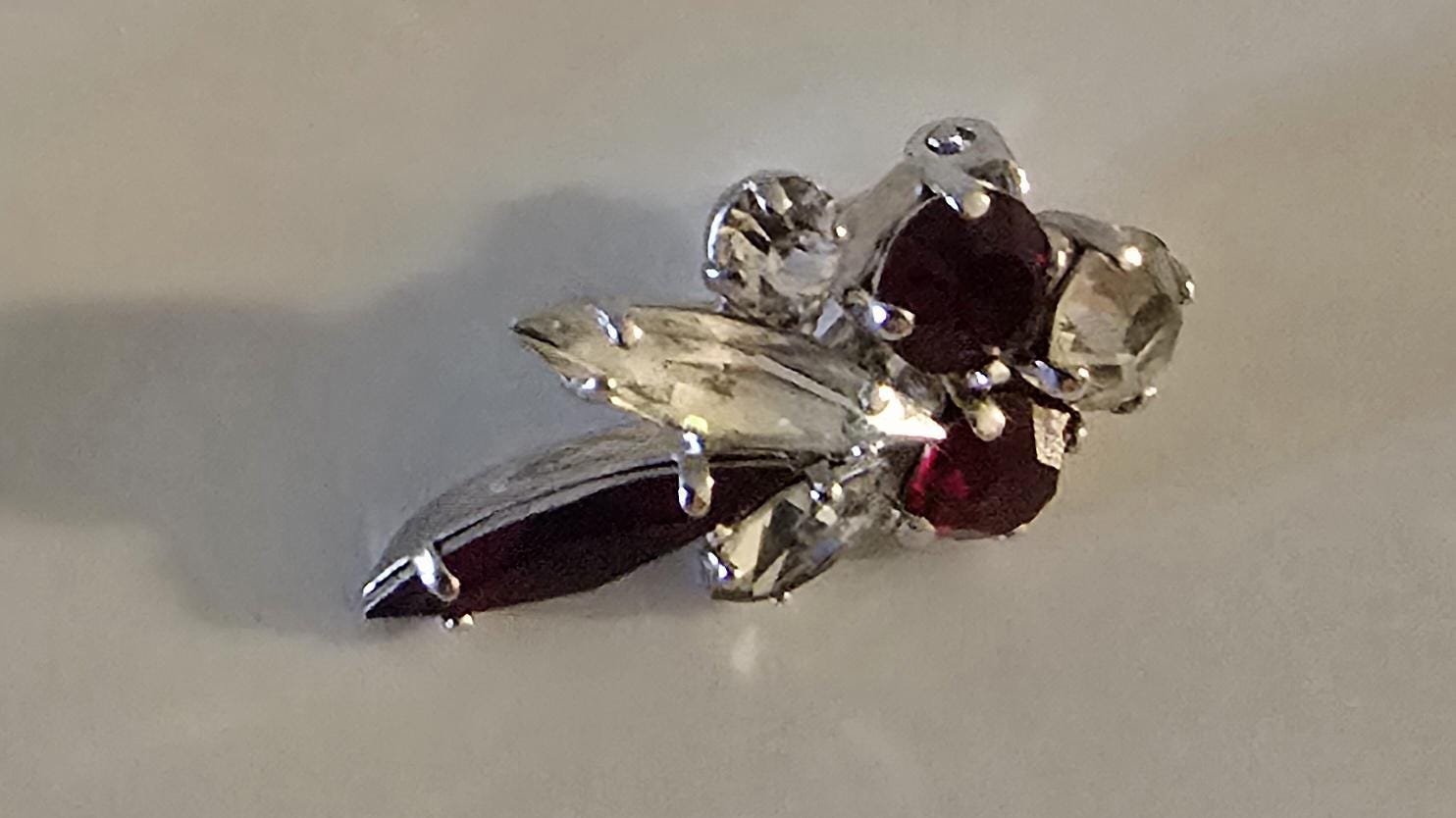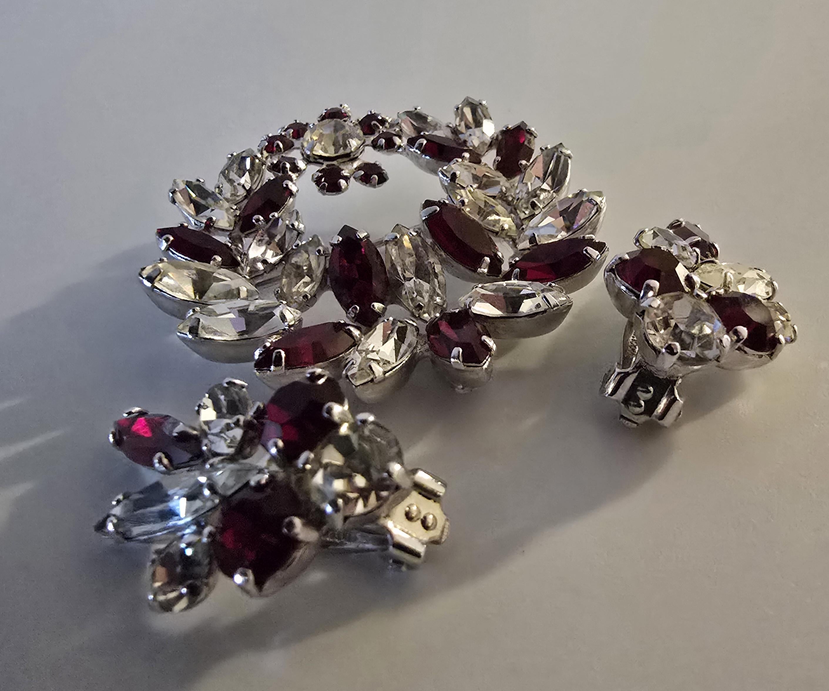 Lovely brooch and earring set by Sherman! Red and clear Swarovski crystals set in silver toned and rhodium plated. Brooch is signed, earrings are not.