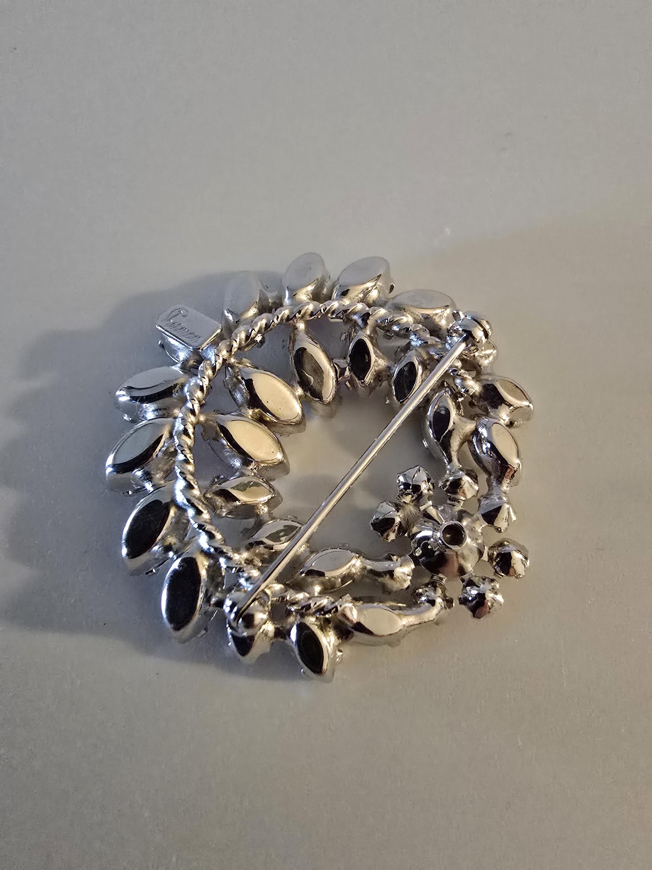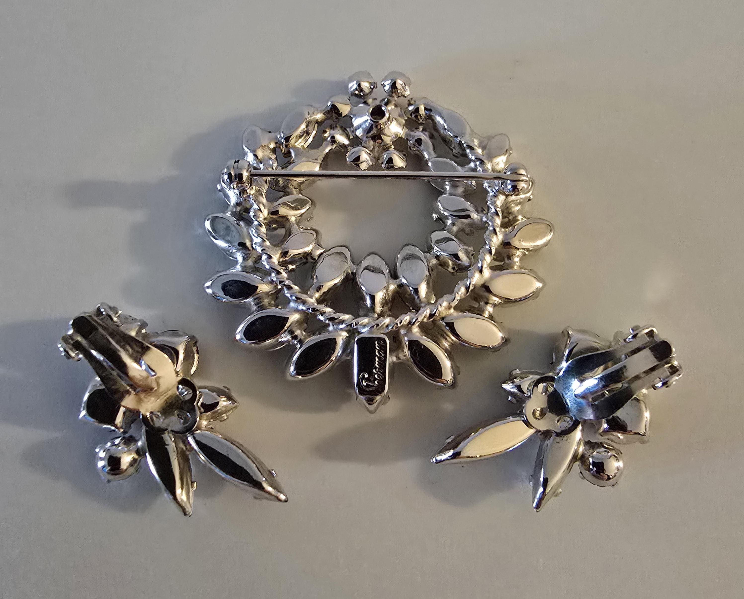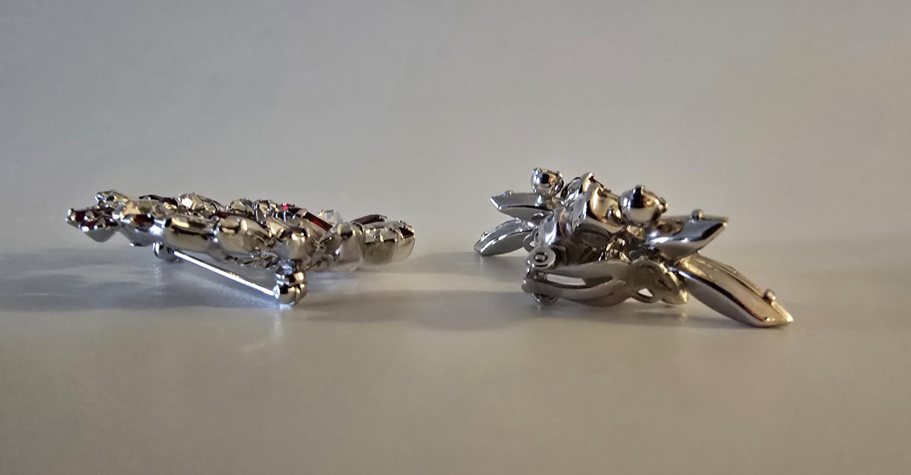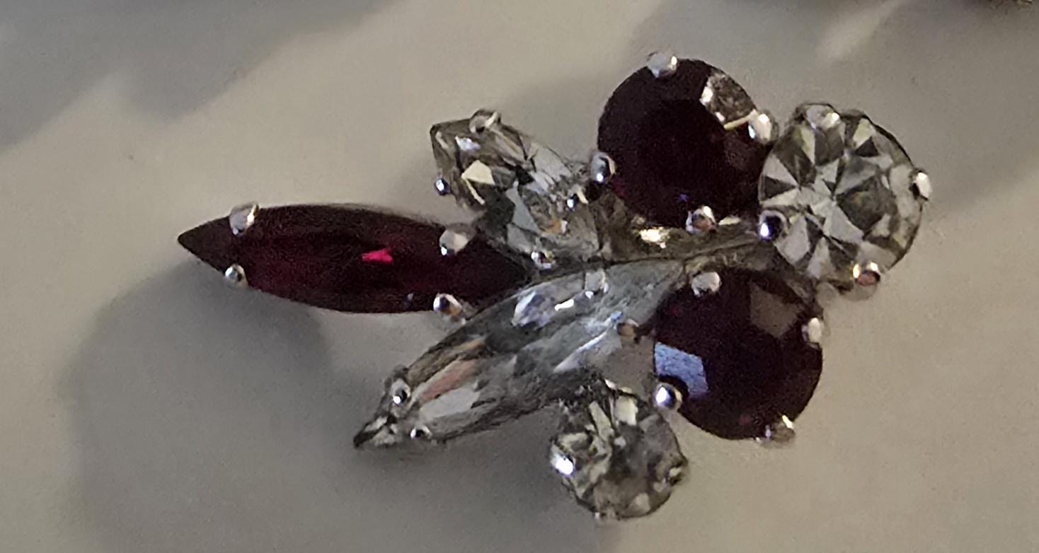 Lovely brooch and earring set by Sherman! Red and clear Swarovski crystals set in silver toned and rhodium plated. Brooch is signed, earrings are not.