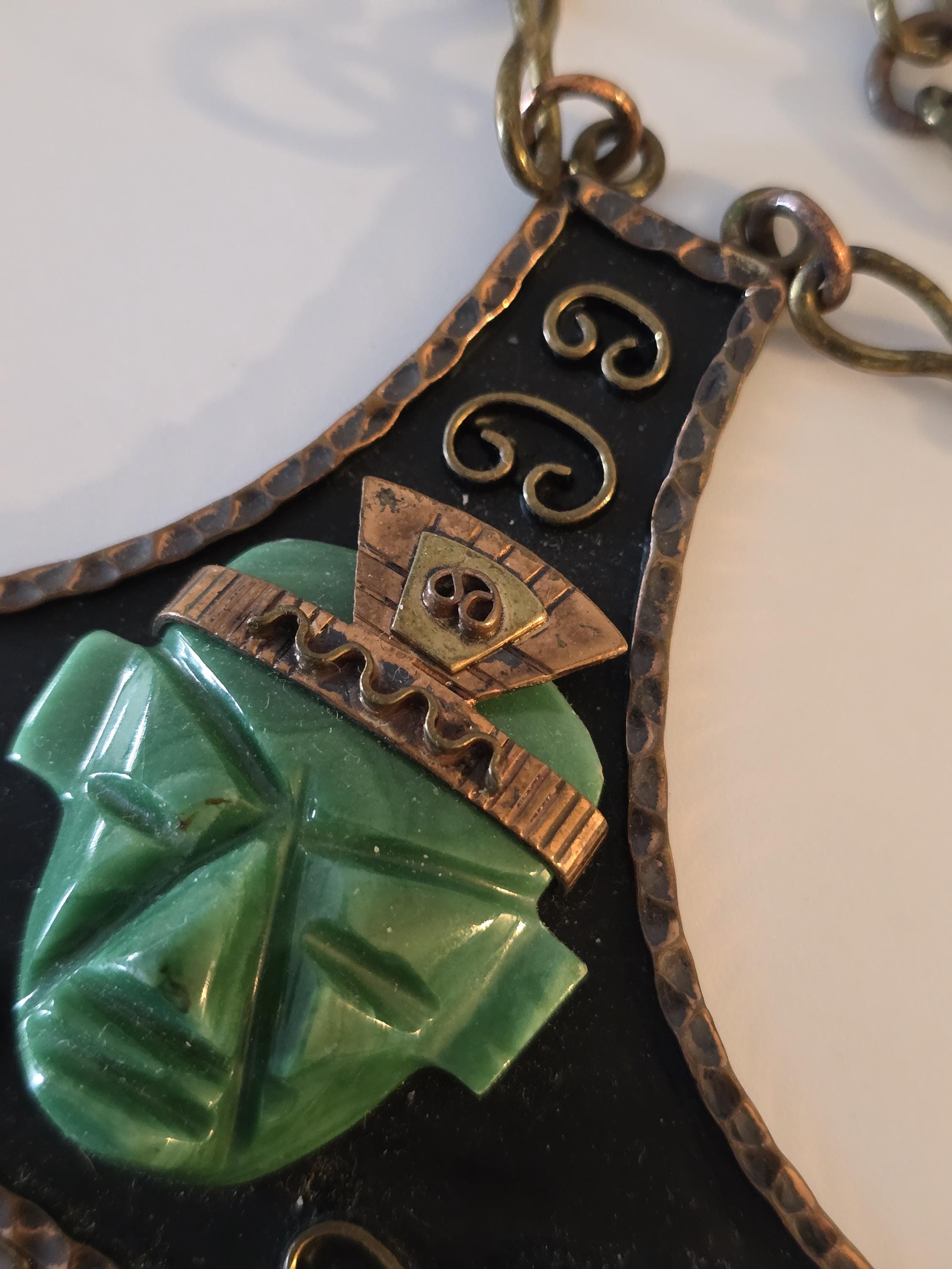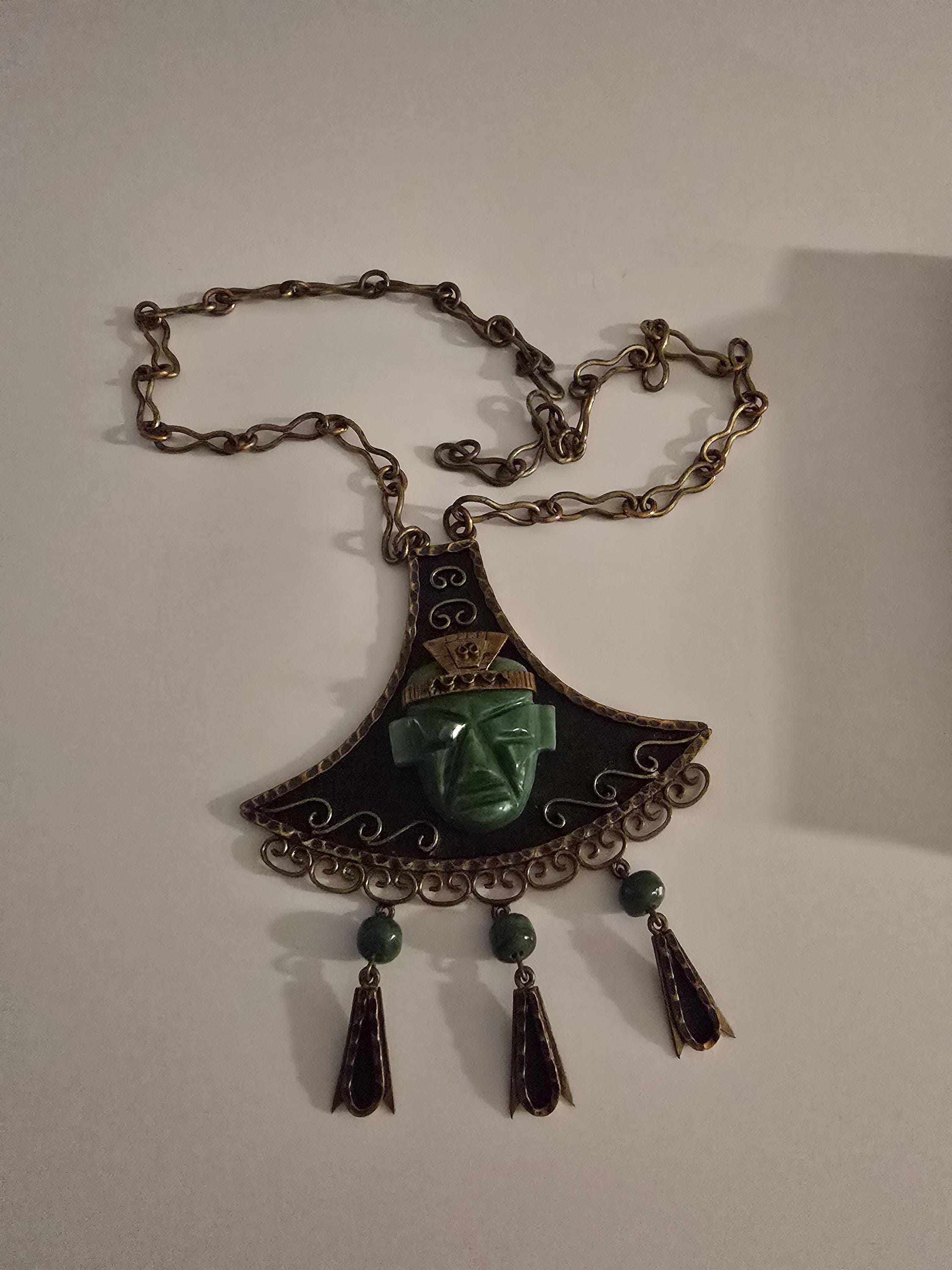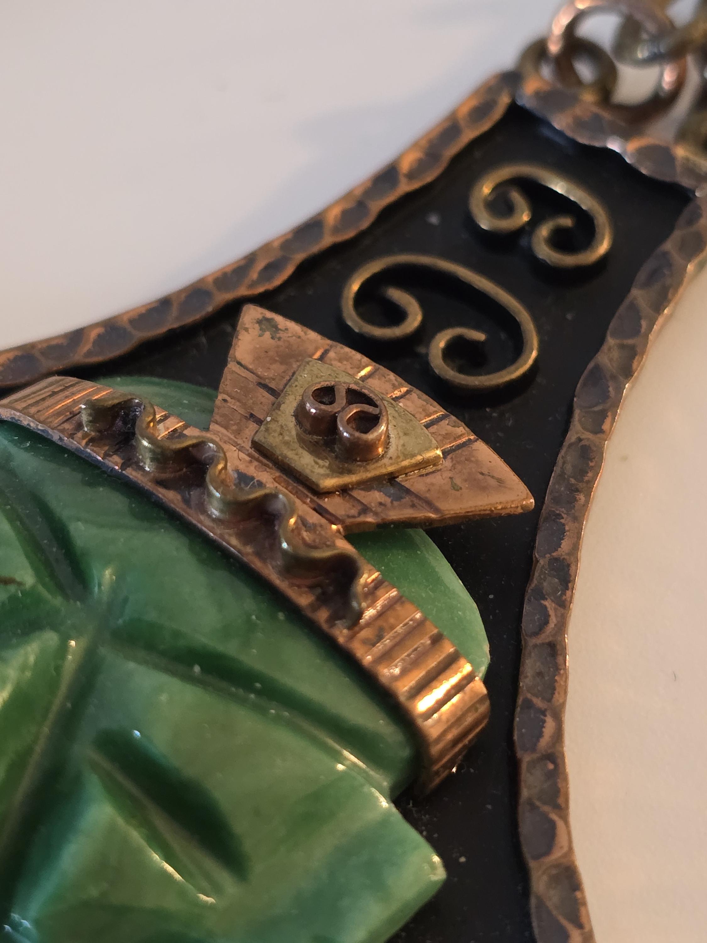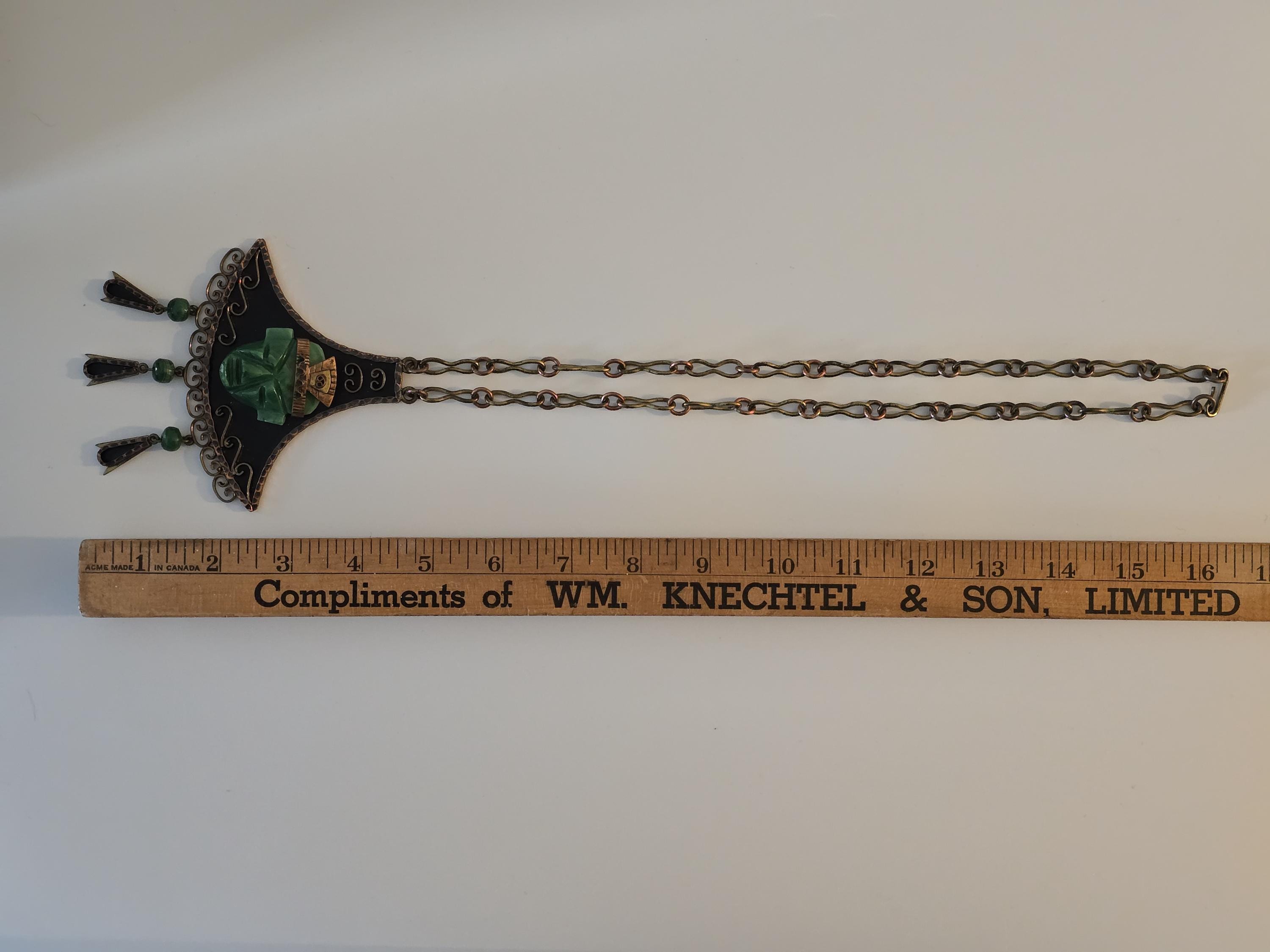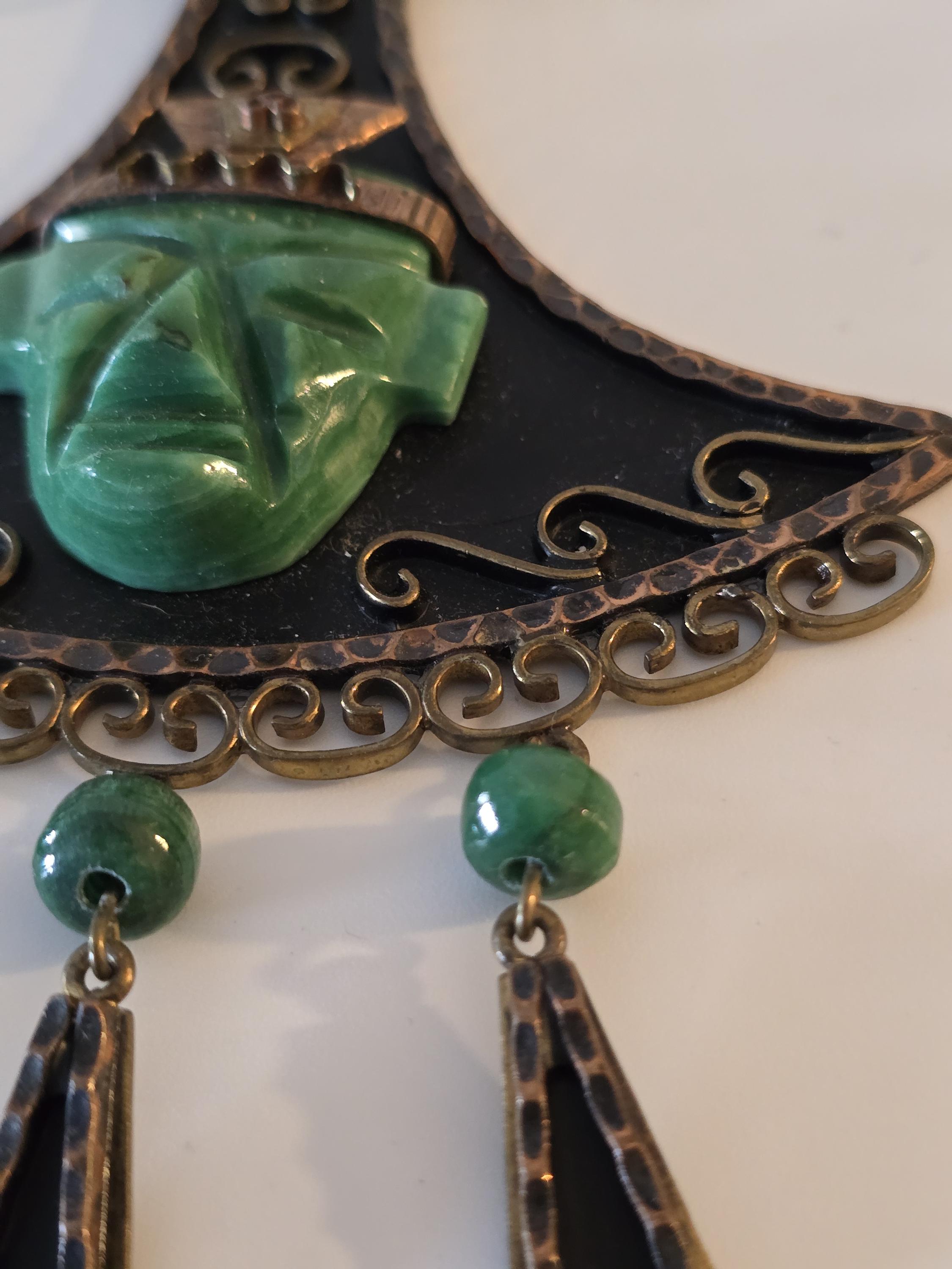 Copper, brass and carved green onyx Mayan necklace.