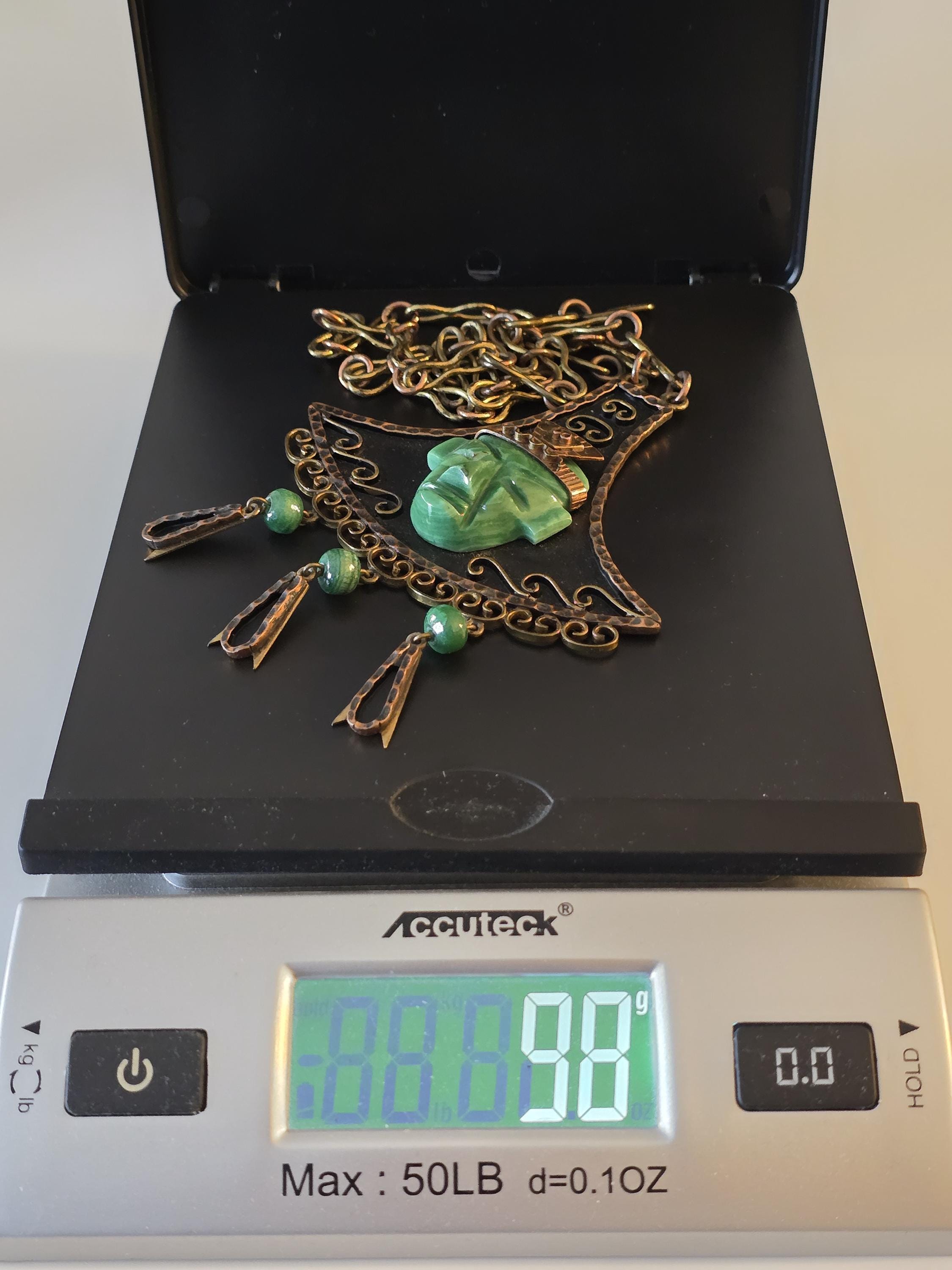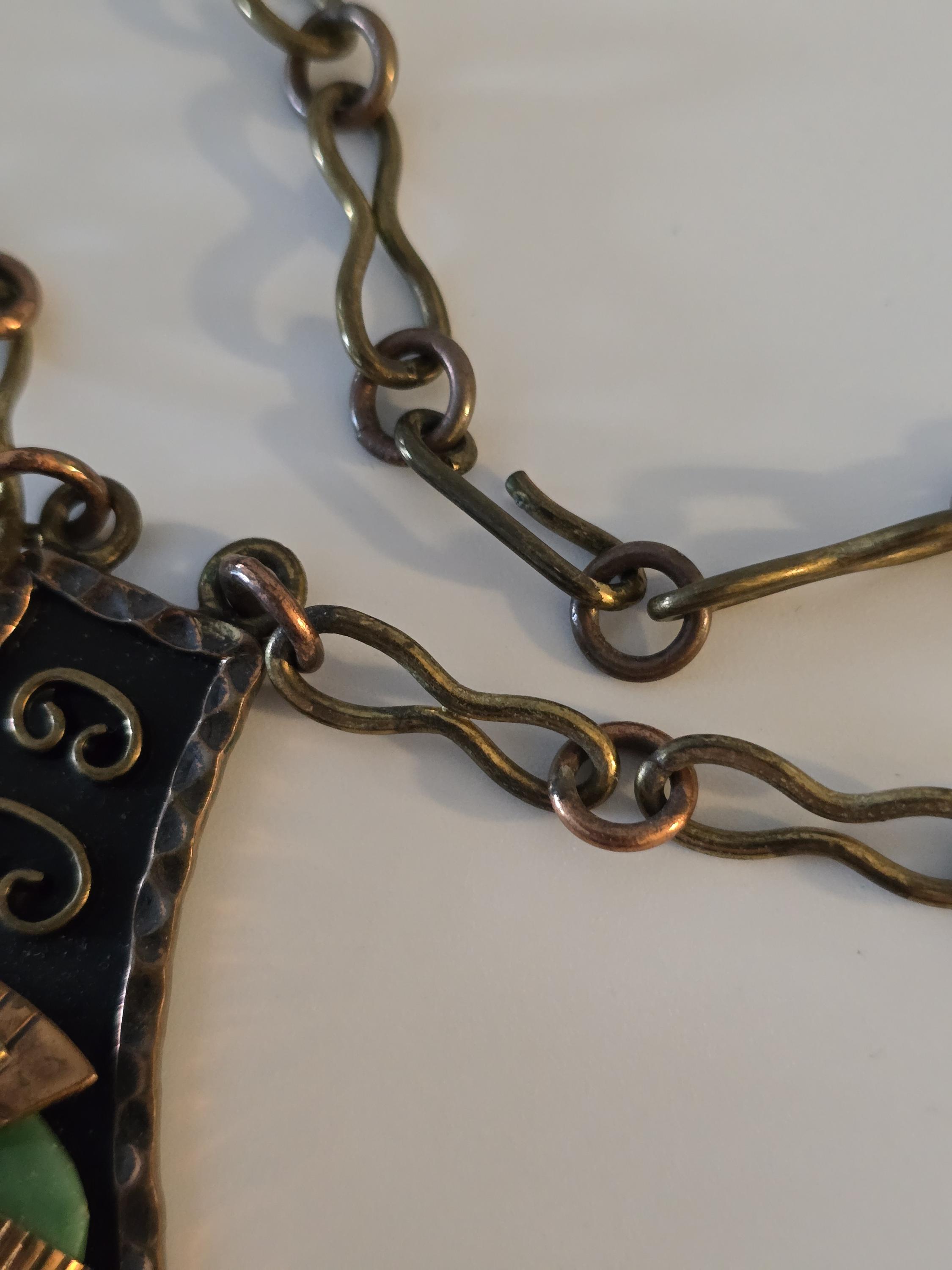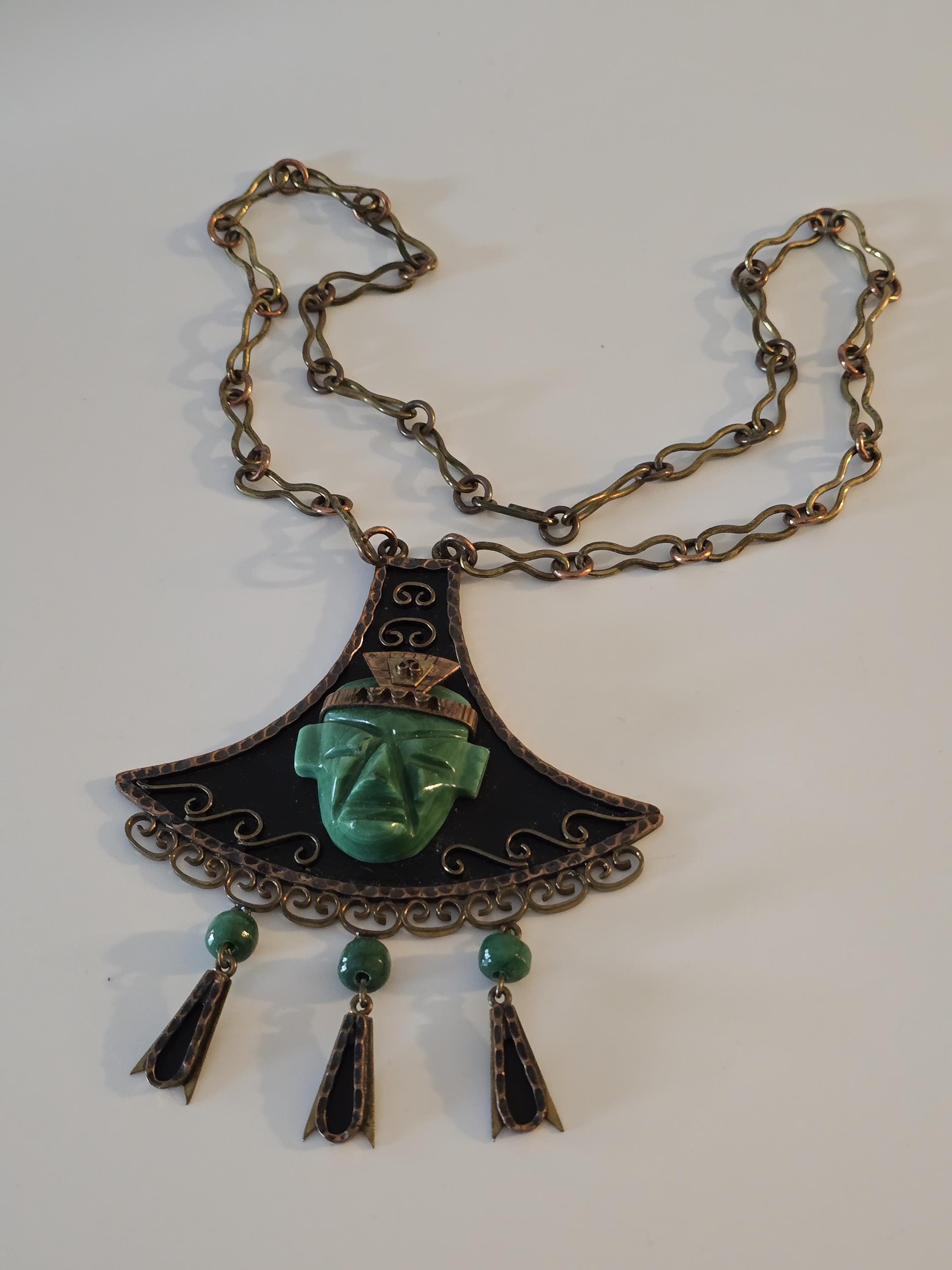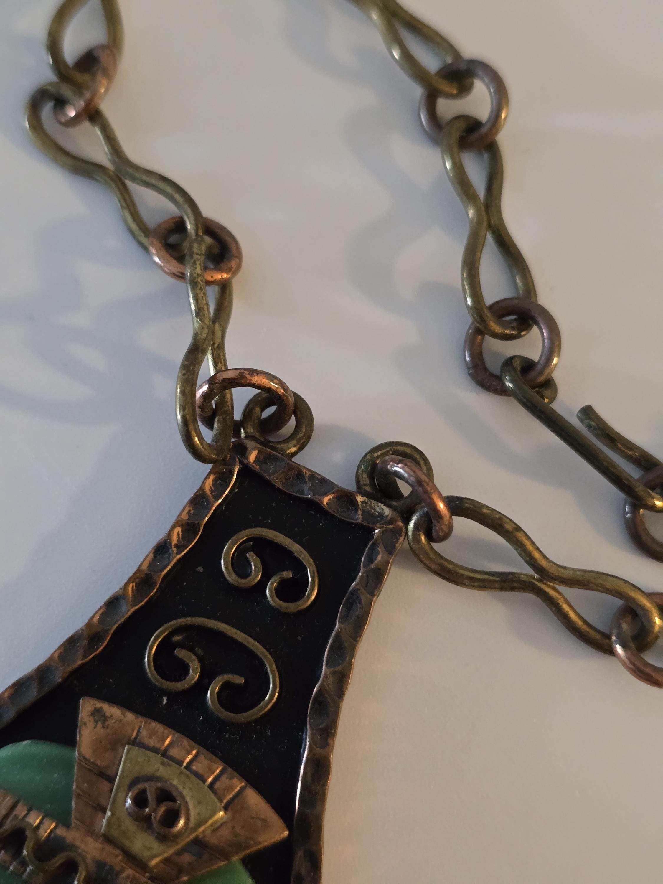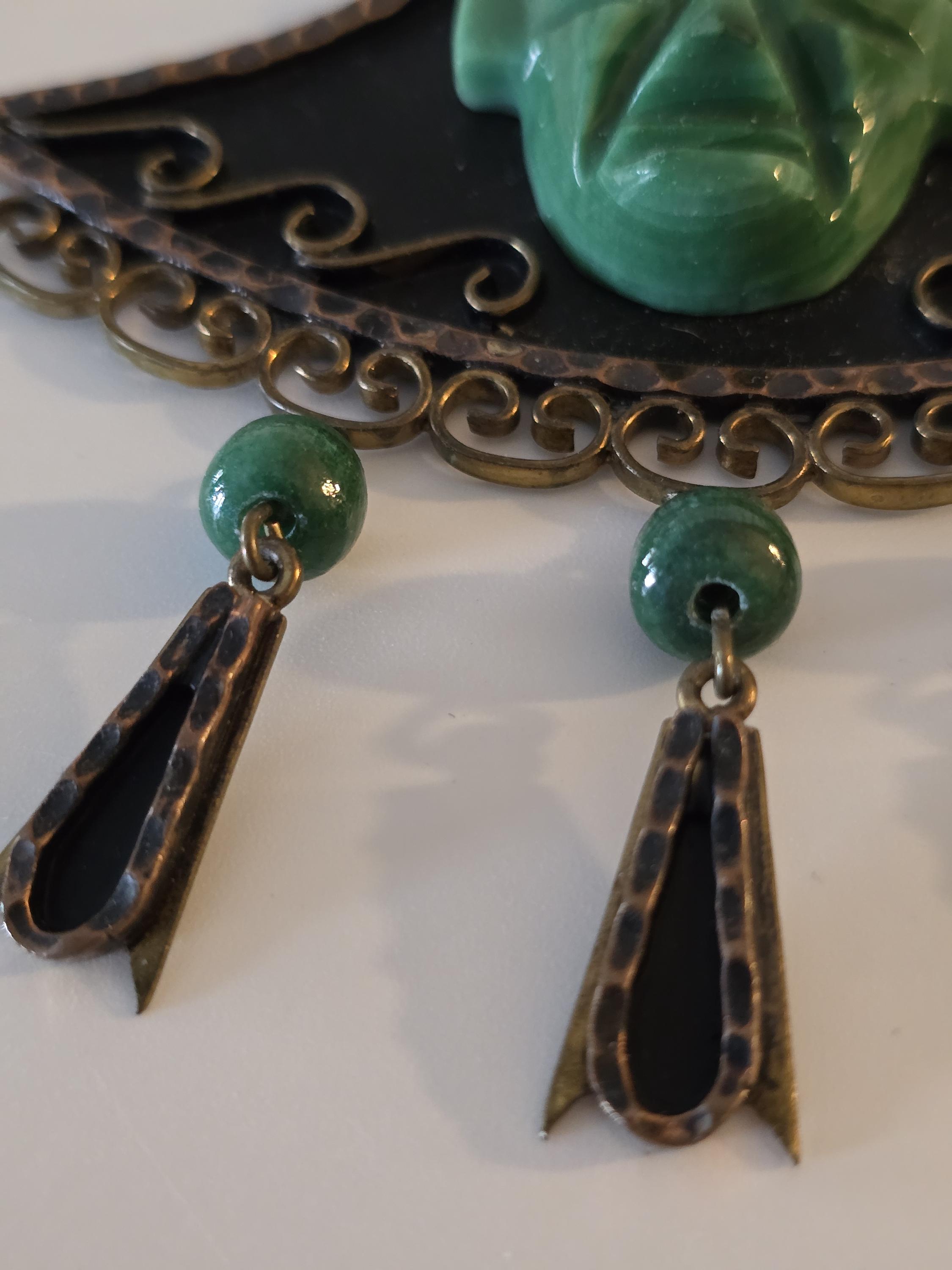 Copper, brass and carved green onyx Mayan necklace.