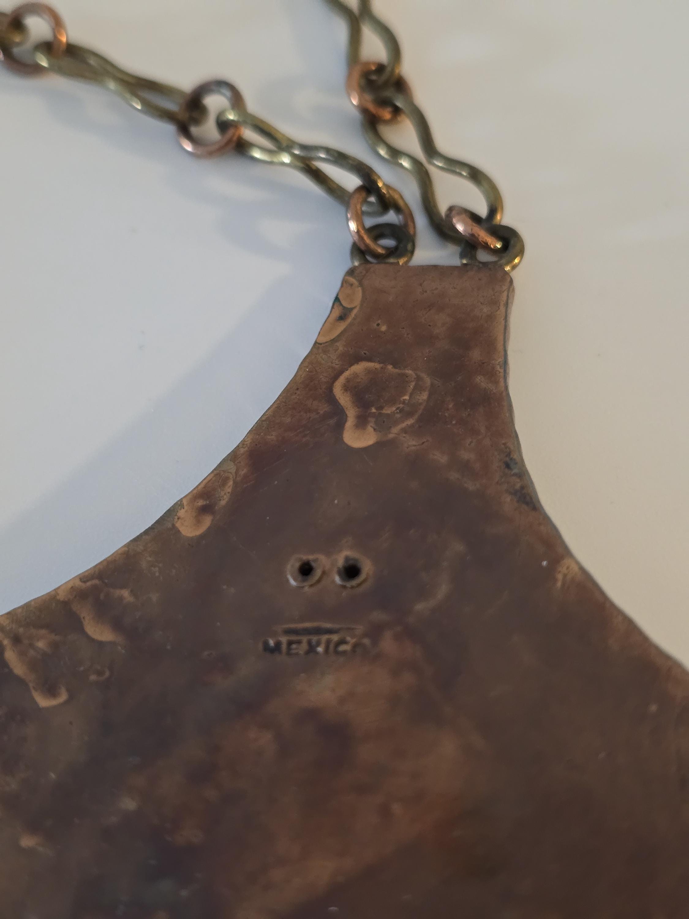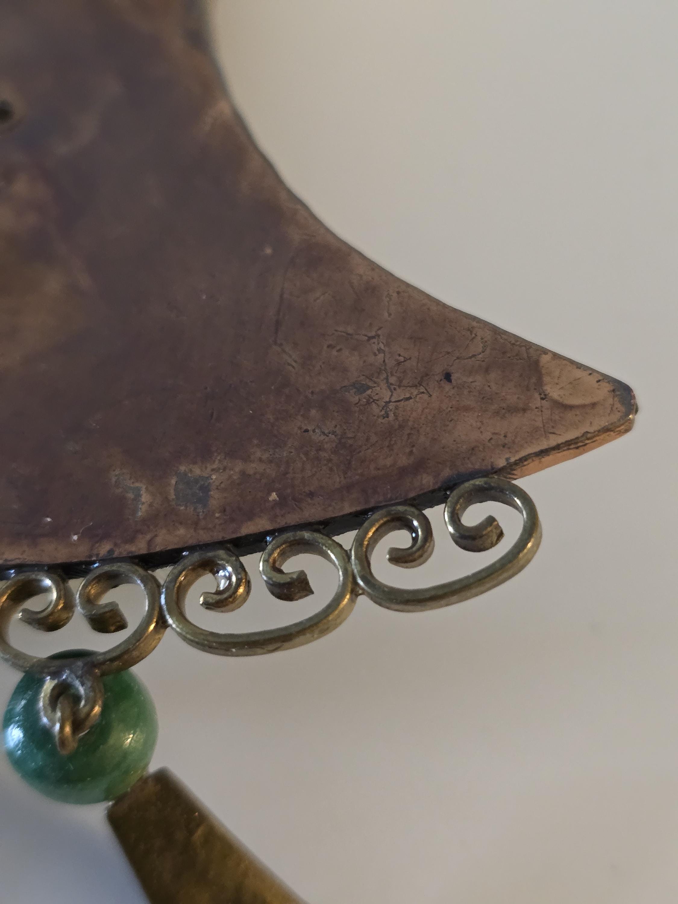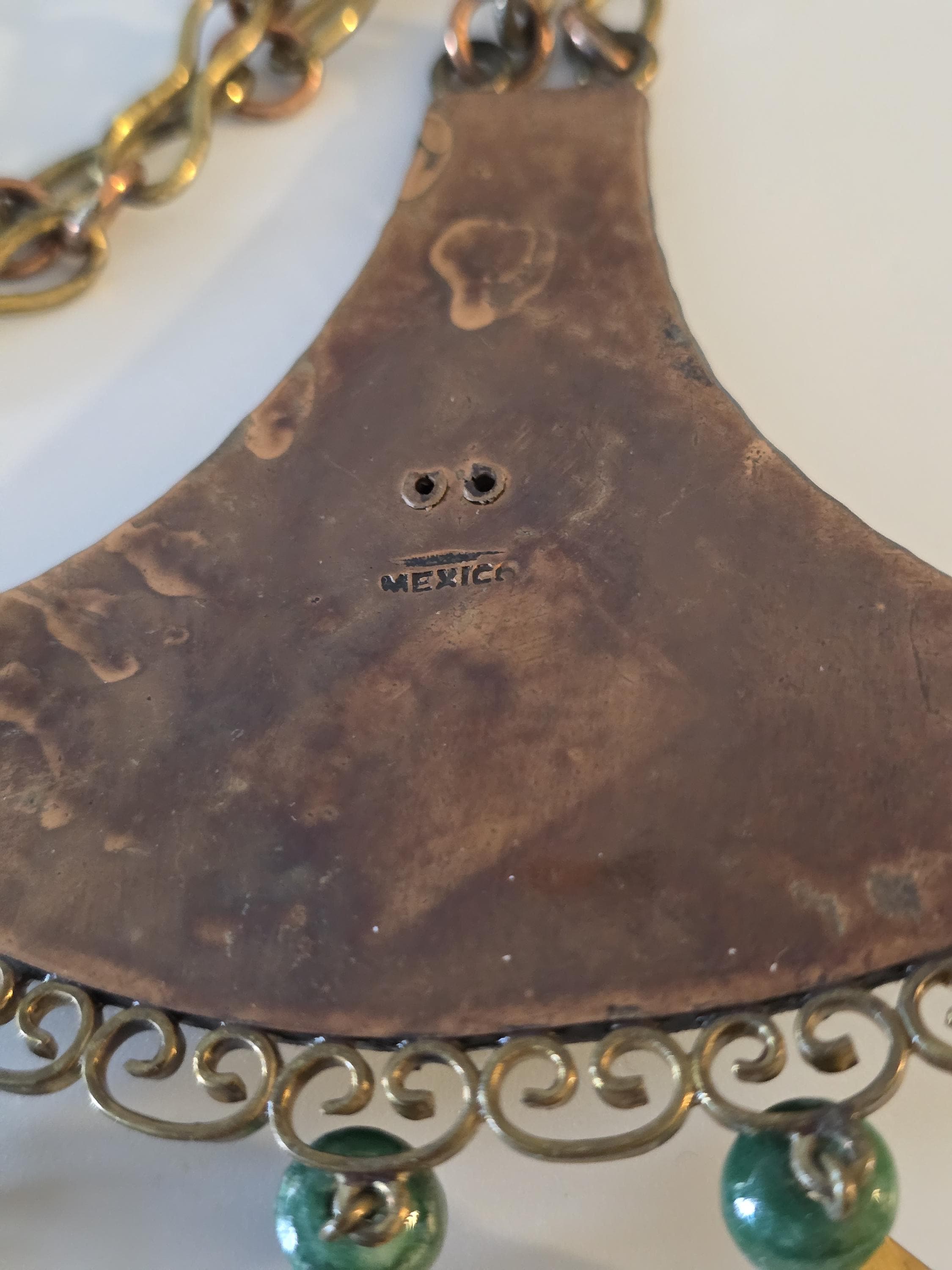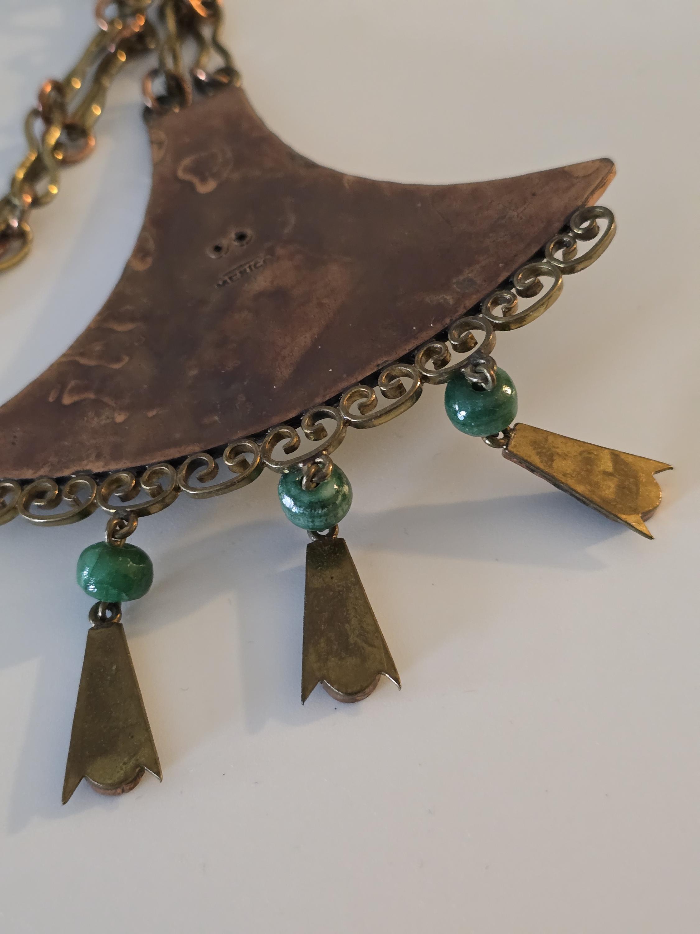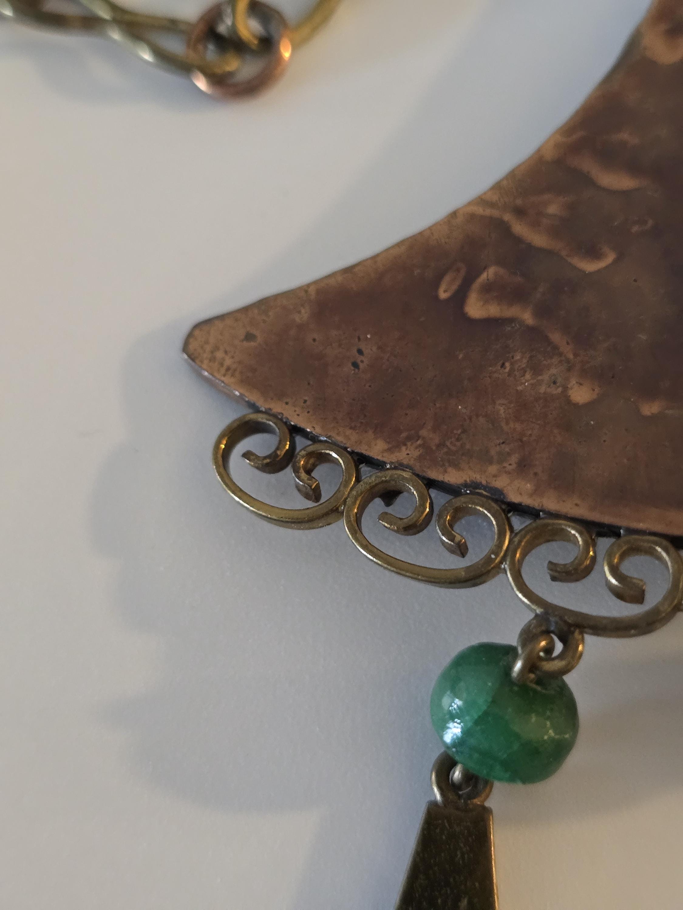 Copper, brass and carved green onyx Mayan necklace.
