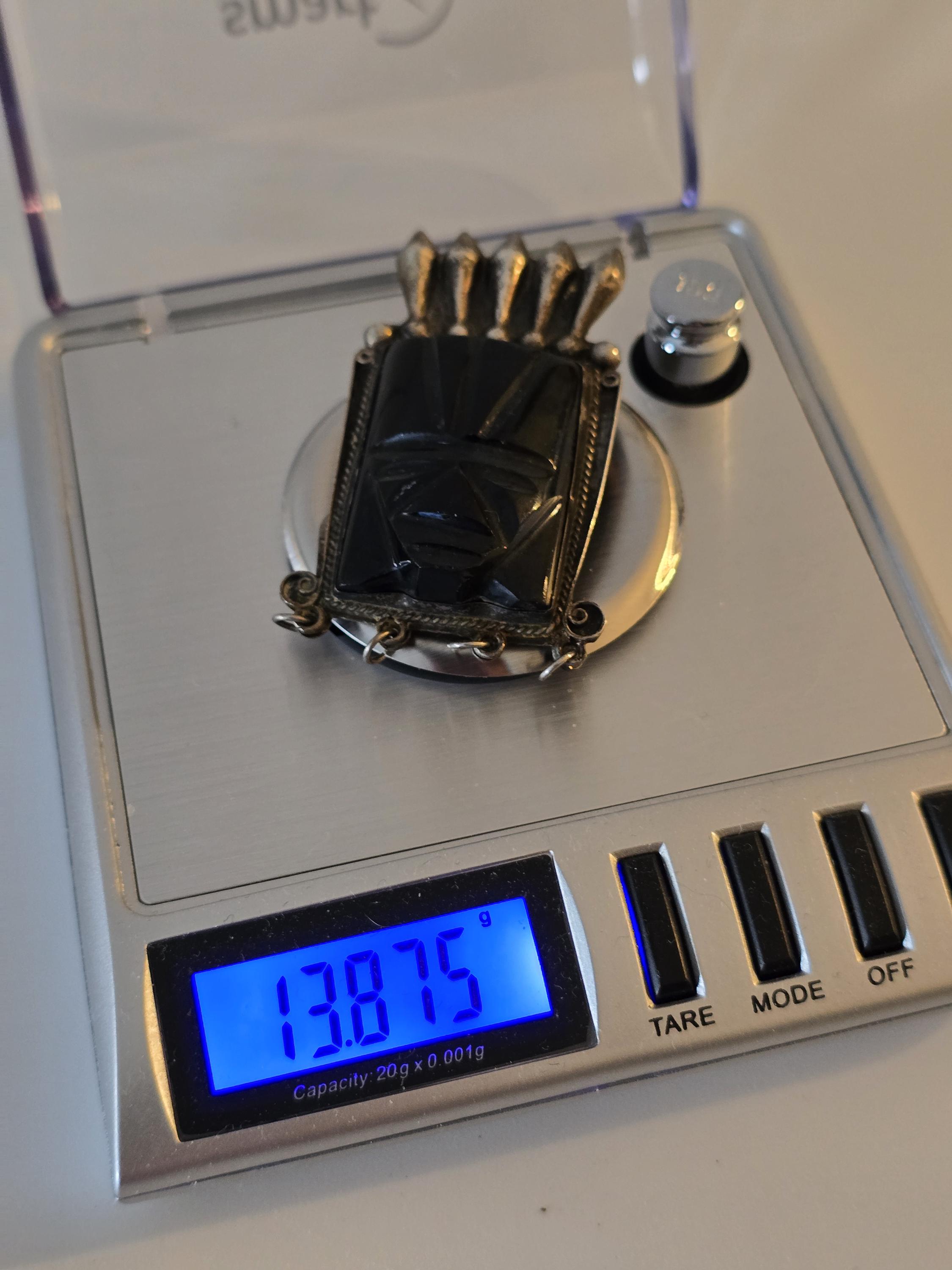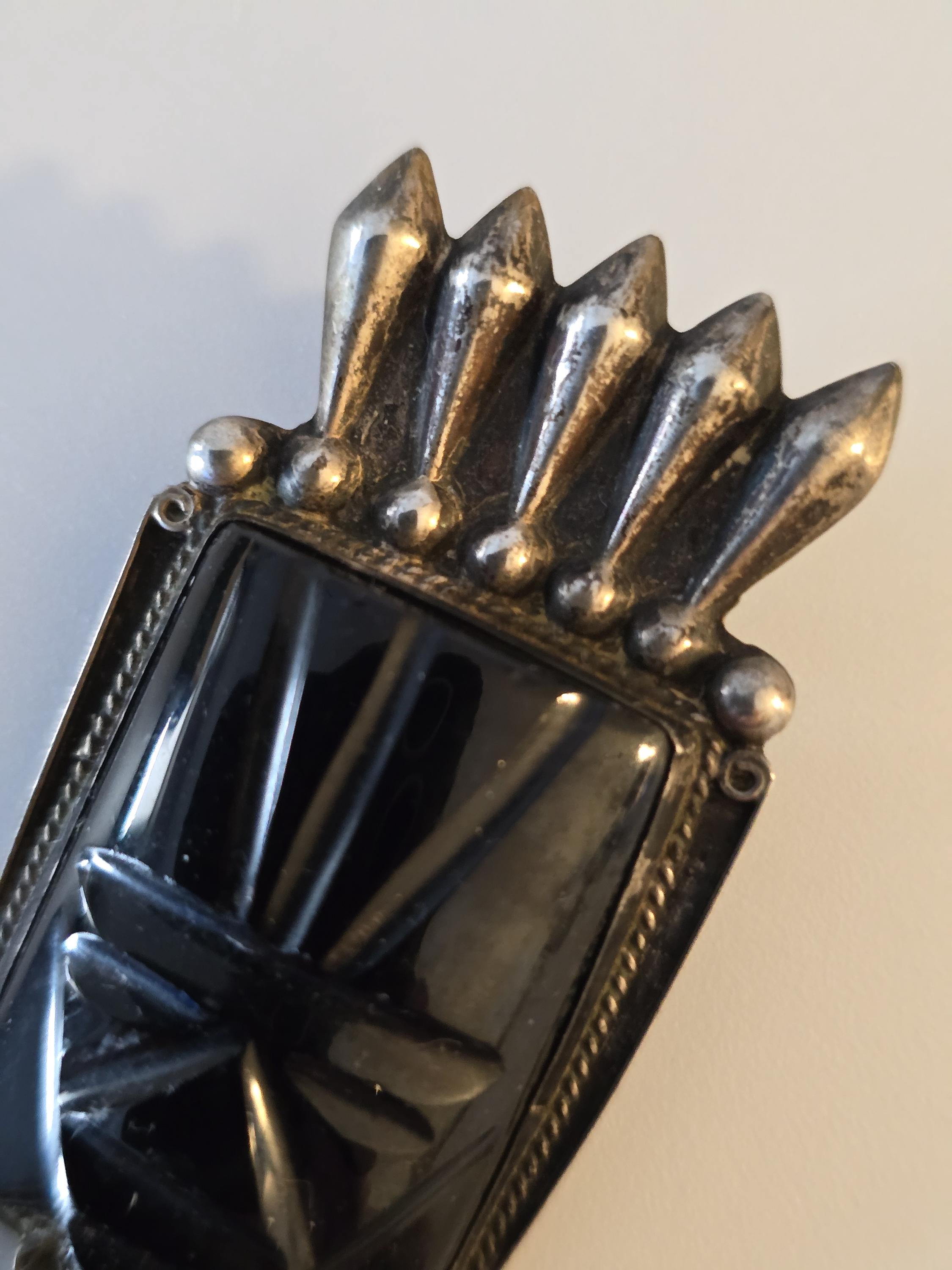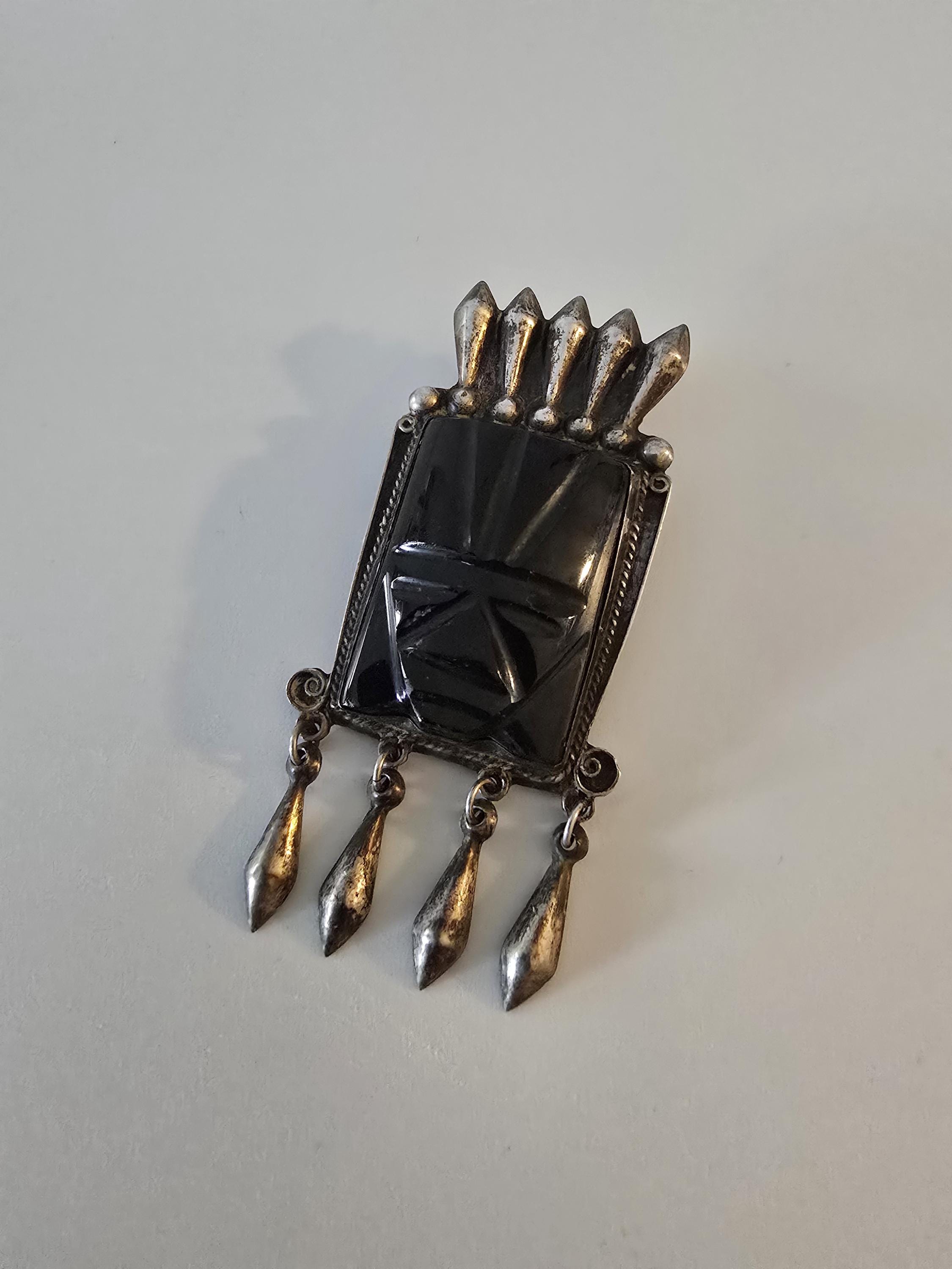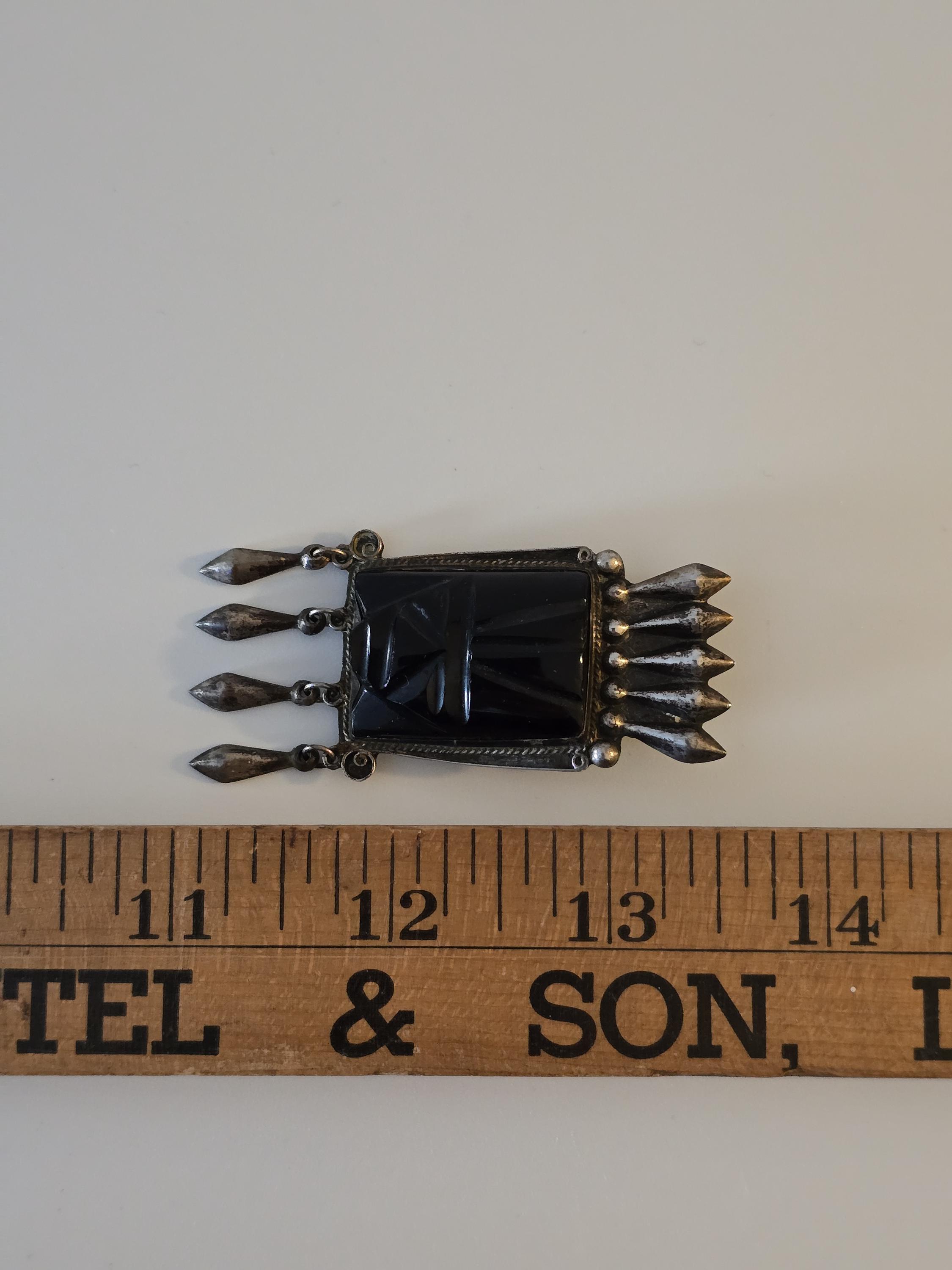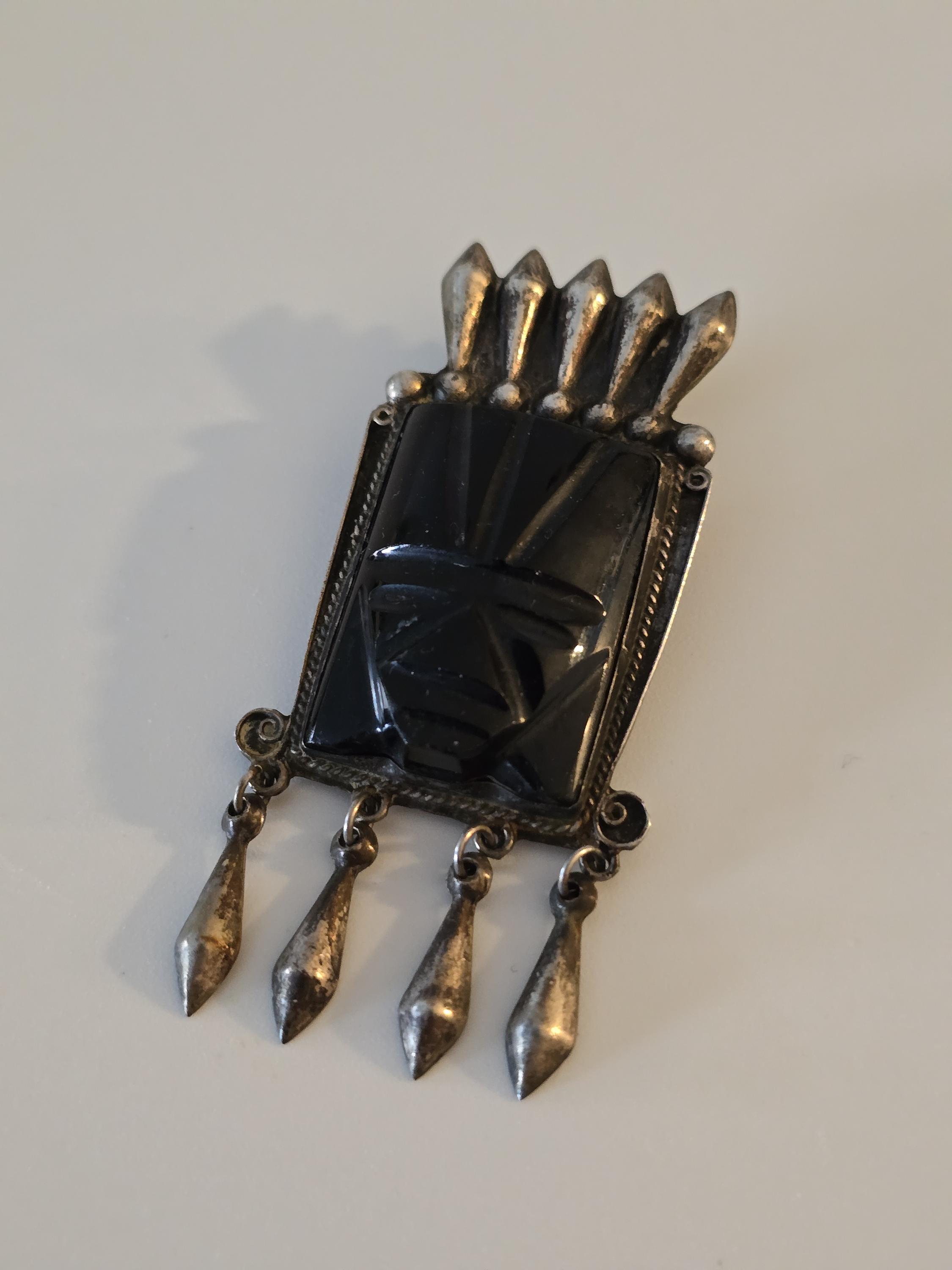 Vintage Mayan carved black onyx and sterling silver brooch,