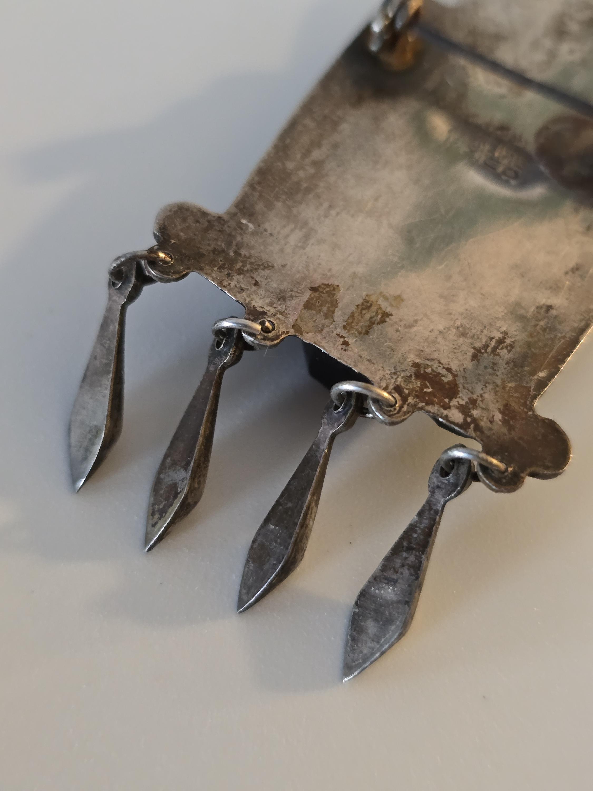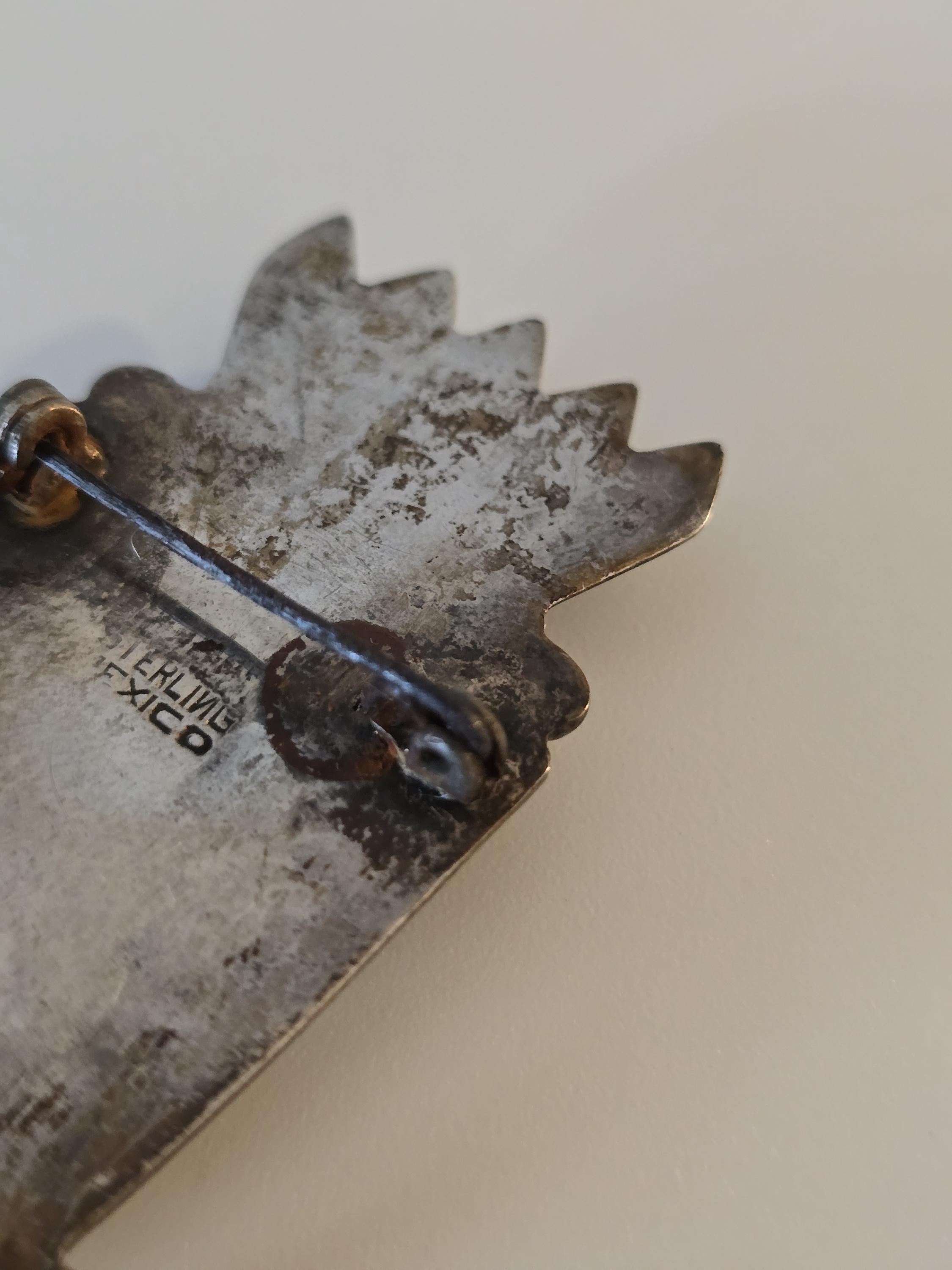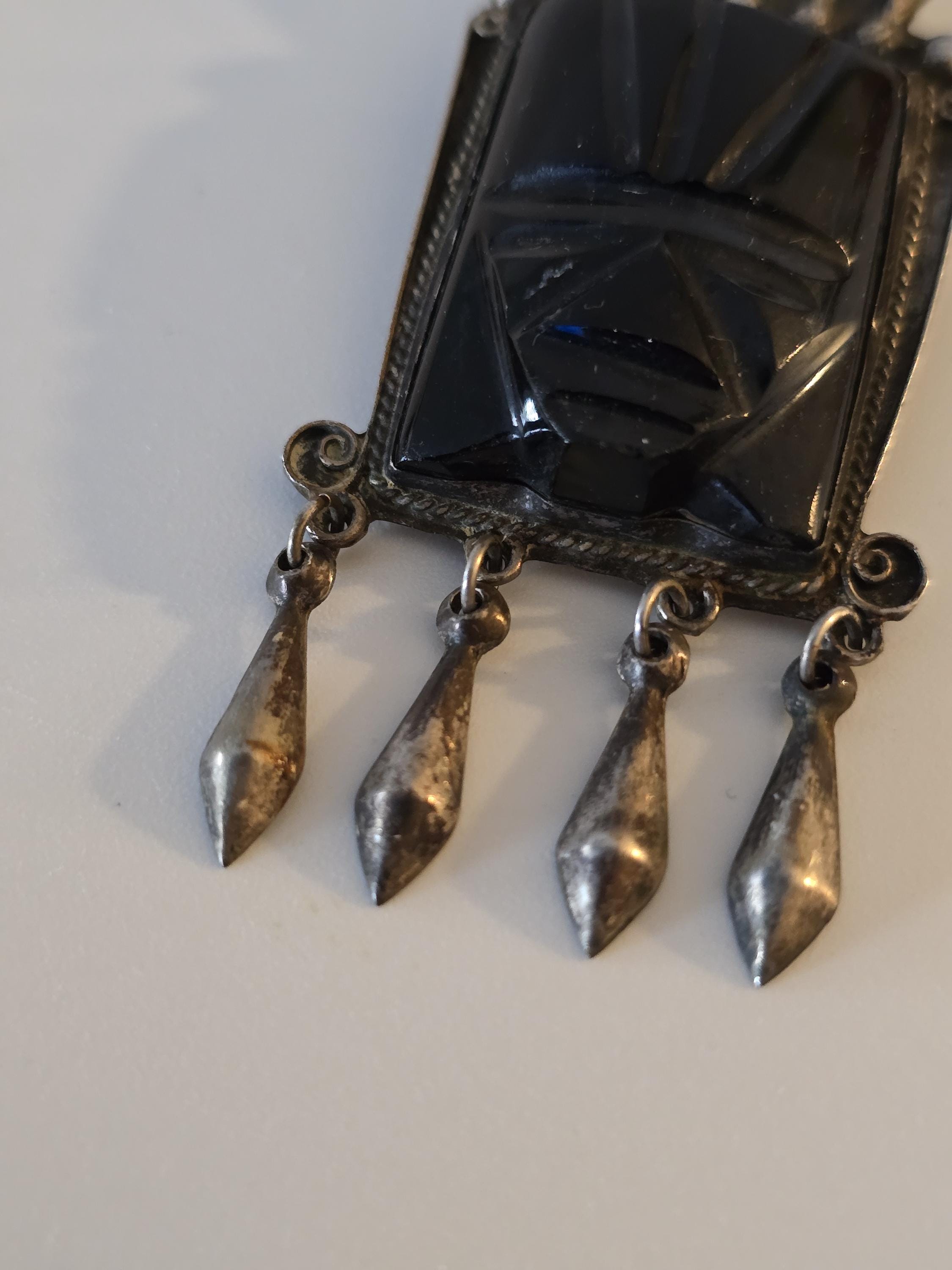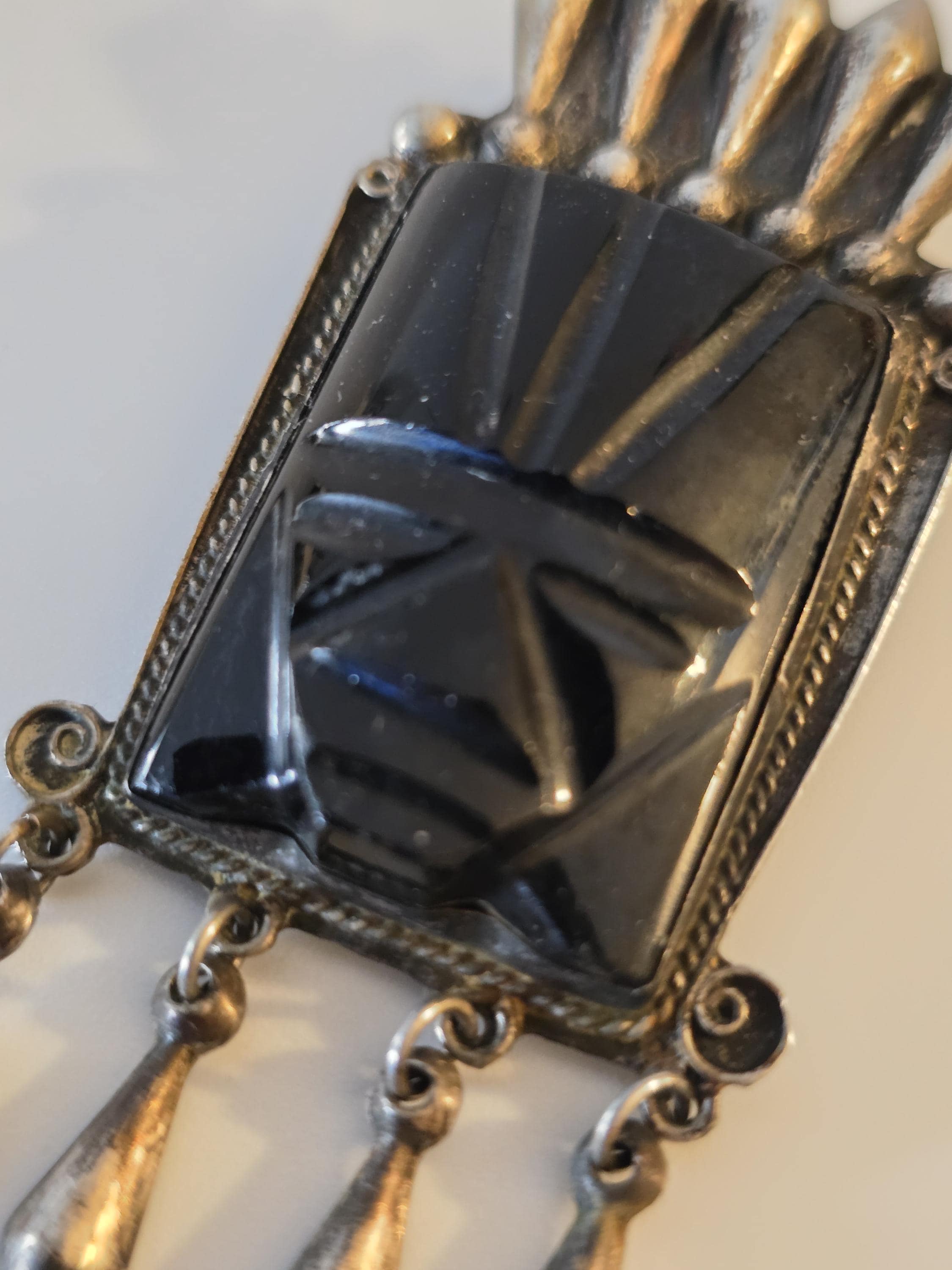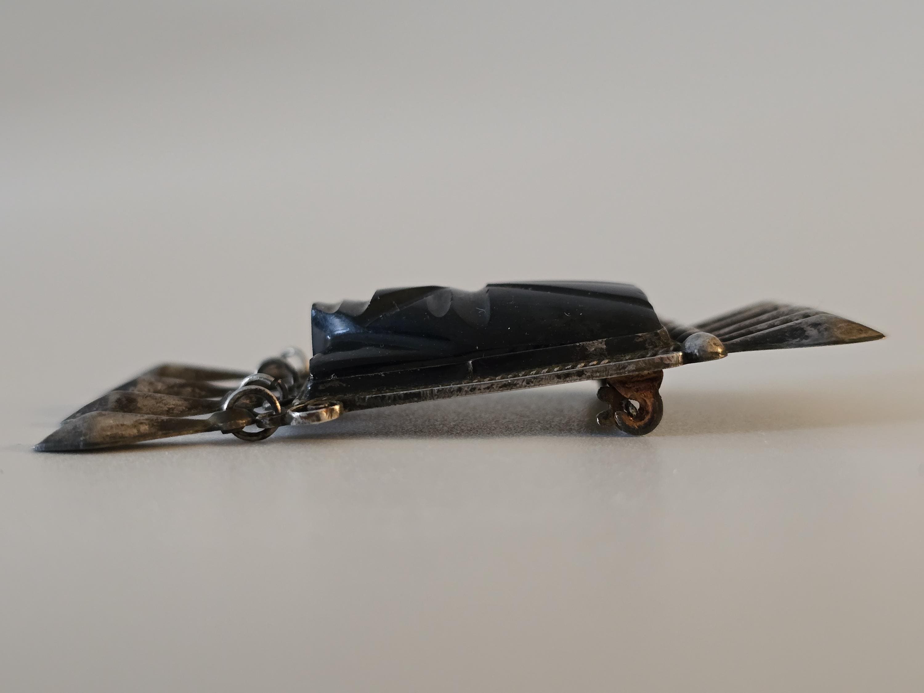 Vintage Mayan carved black onyx and sterling silver brooch,
