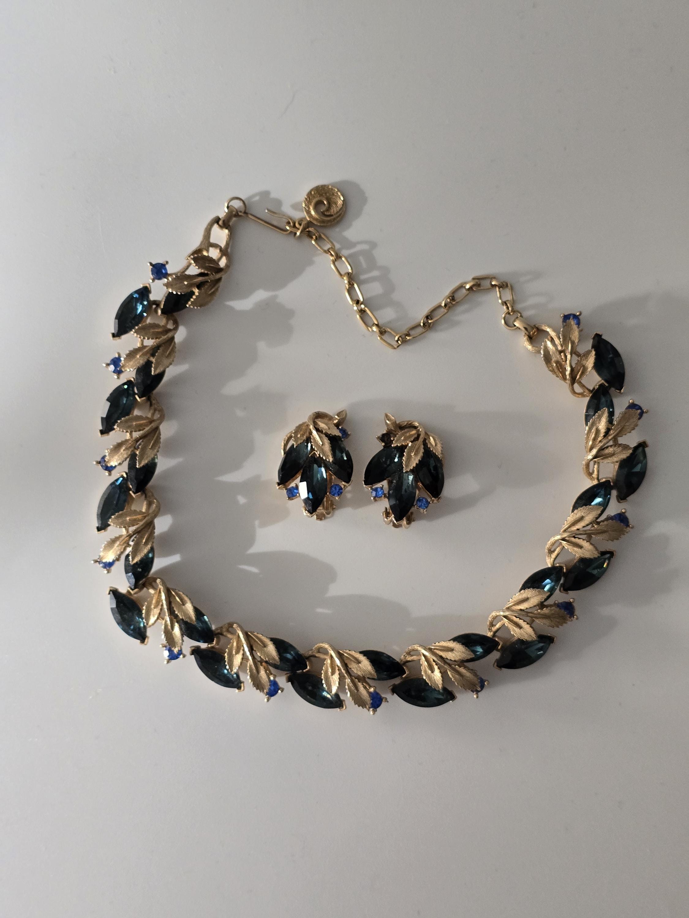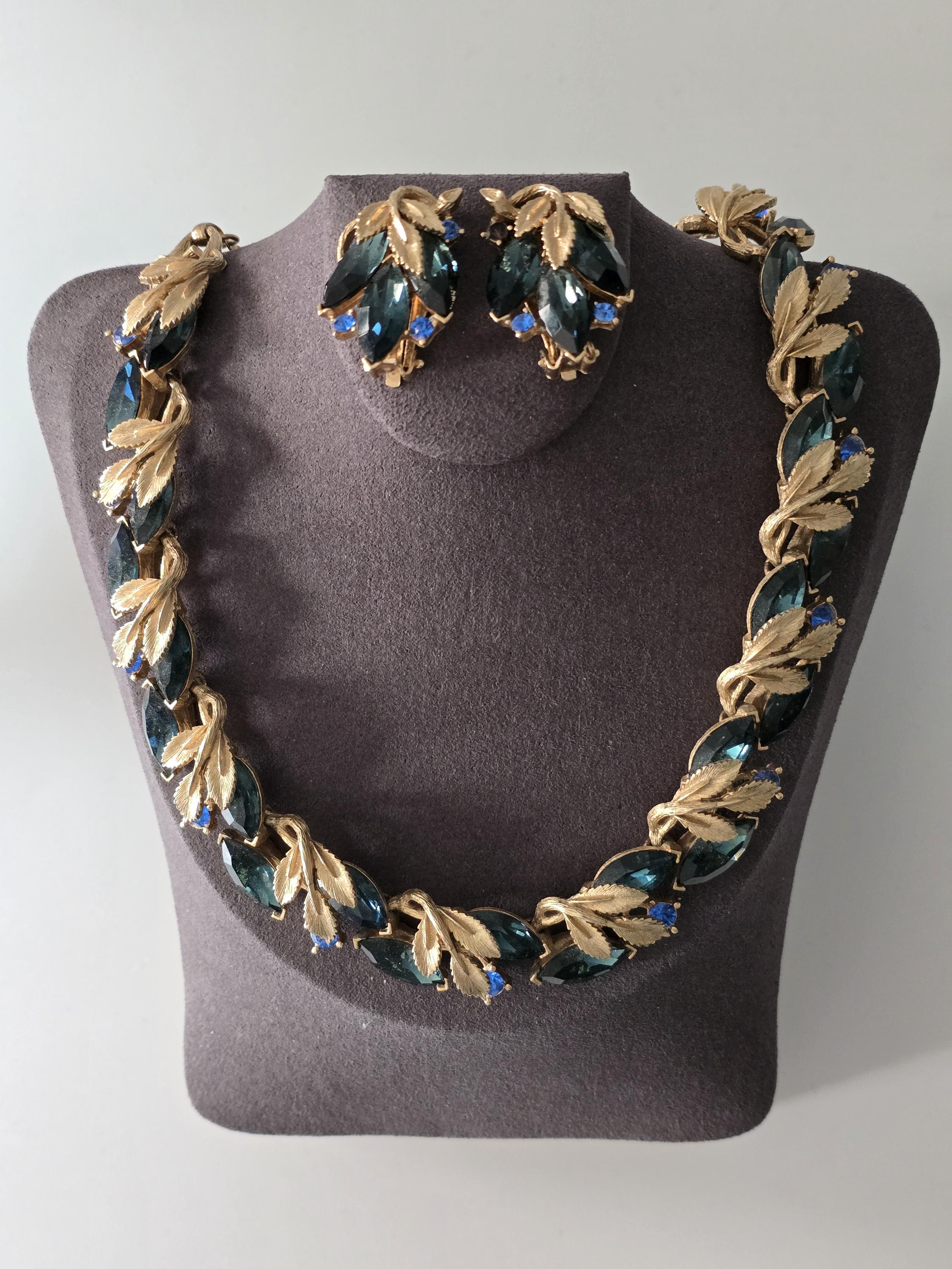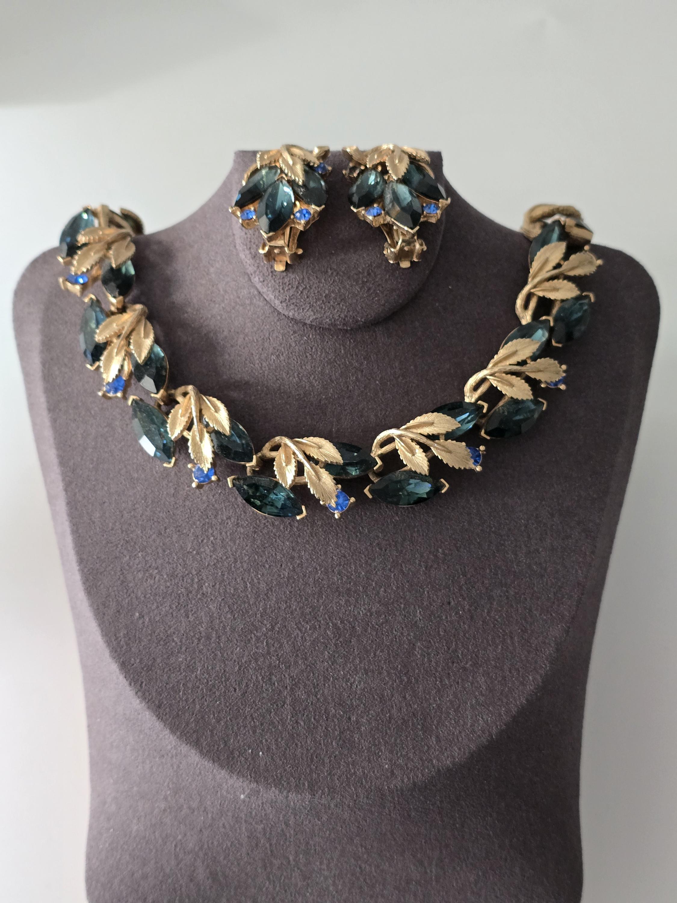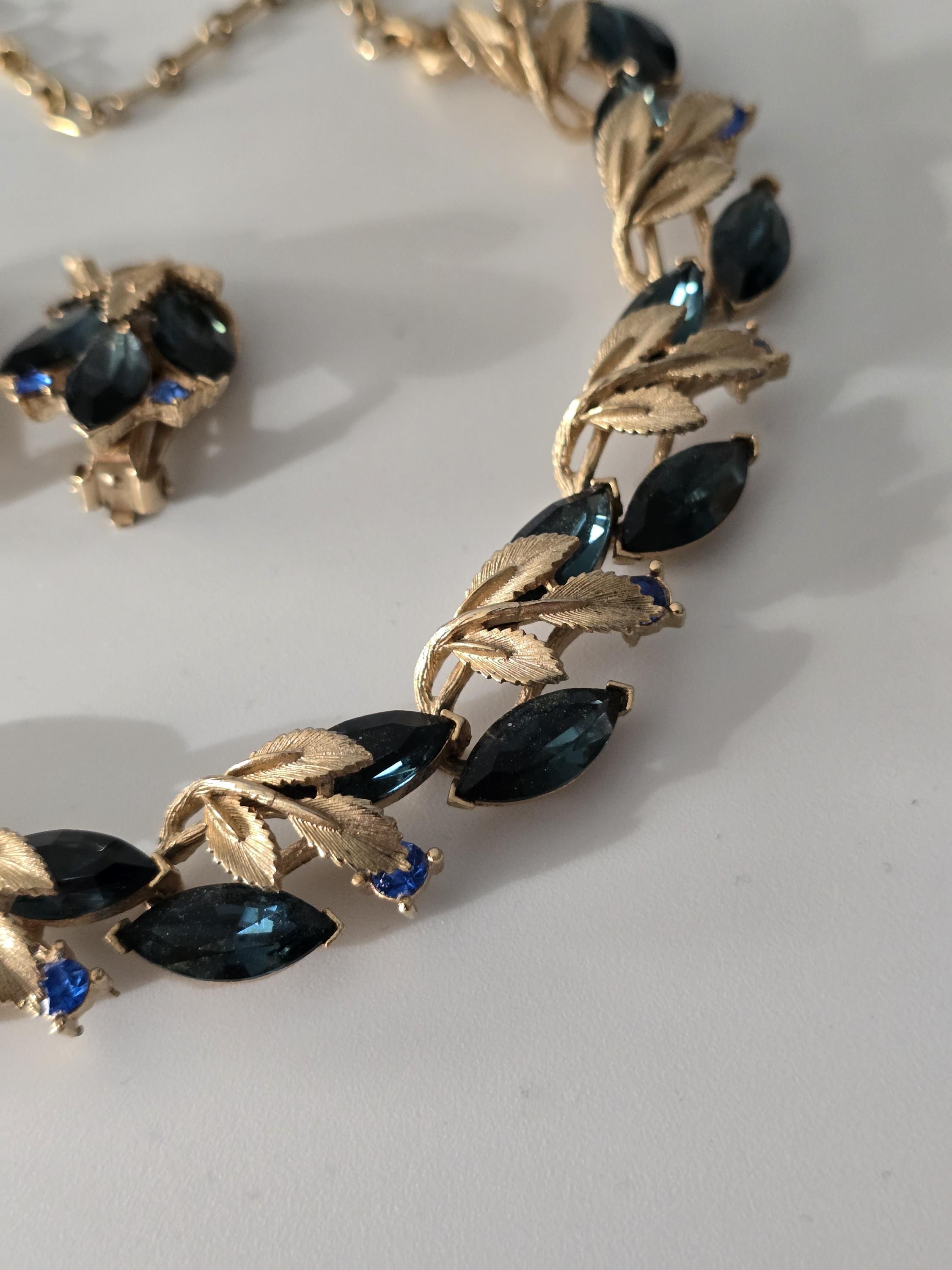 Stunning LISNER gold tone with blue crystals! Necklace and clip on earrings.